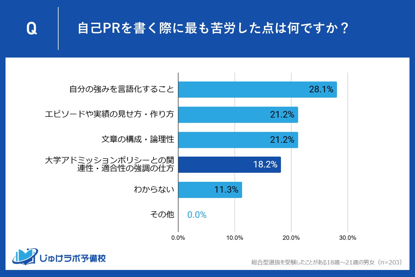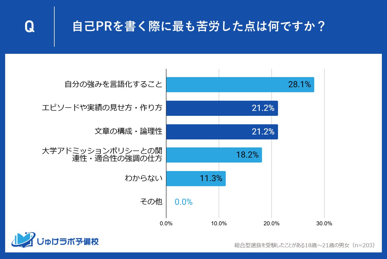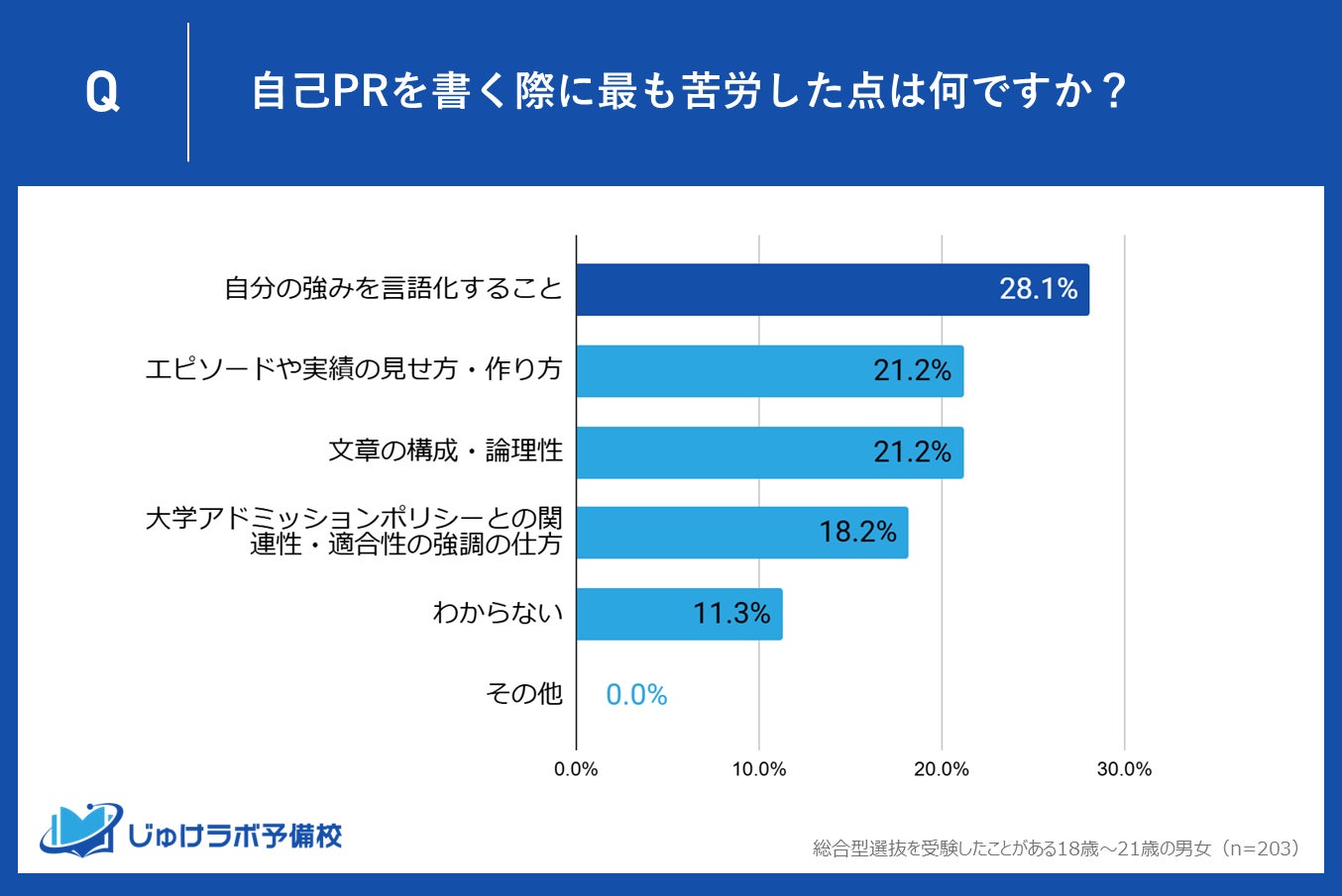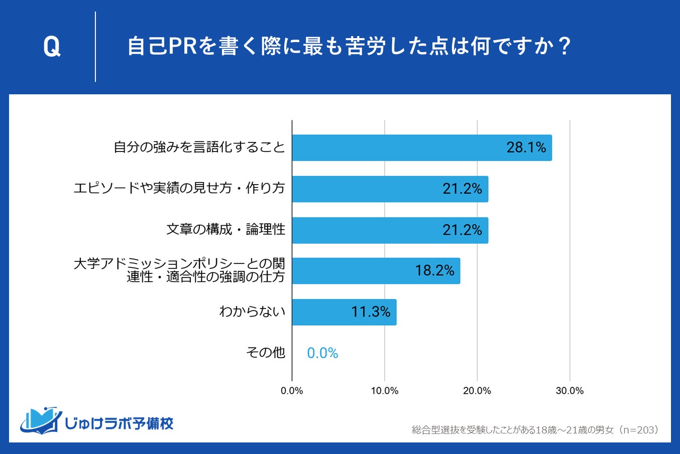 本調査は、総合型選抜入試を経験した18~21歳の男女203人を対象に実施。自己PR作成時に受験生が直面する苦悩を探りました。その結果、「自分の強みを言語化する」ことに苦労している受験生が最も多く、全体の28.1%にのぼることが明らかになりました。
