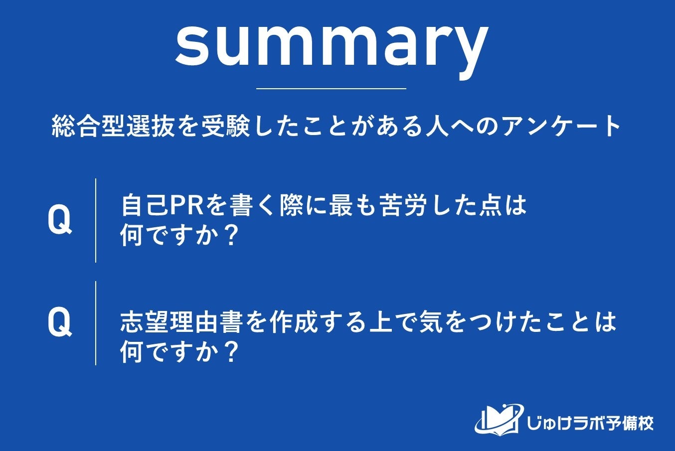 じゅけラボ予備校(所在地:大阪市北区、代表取締役:後藤智則)は、総合型選抜入試で大学受験をした18歳〜21歳の男女203人を対象に、総合型選抜受験生の自己PRおよび志望理由書作成における苦労と取り組みに関する実態調査を実施しました。