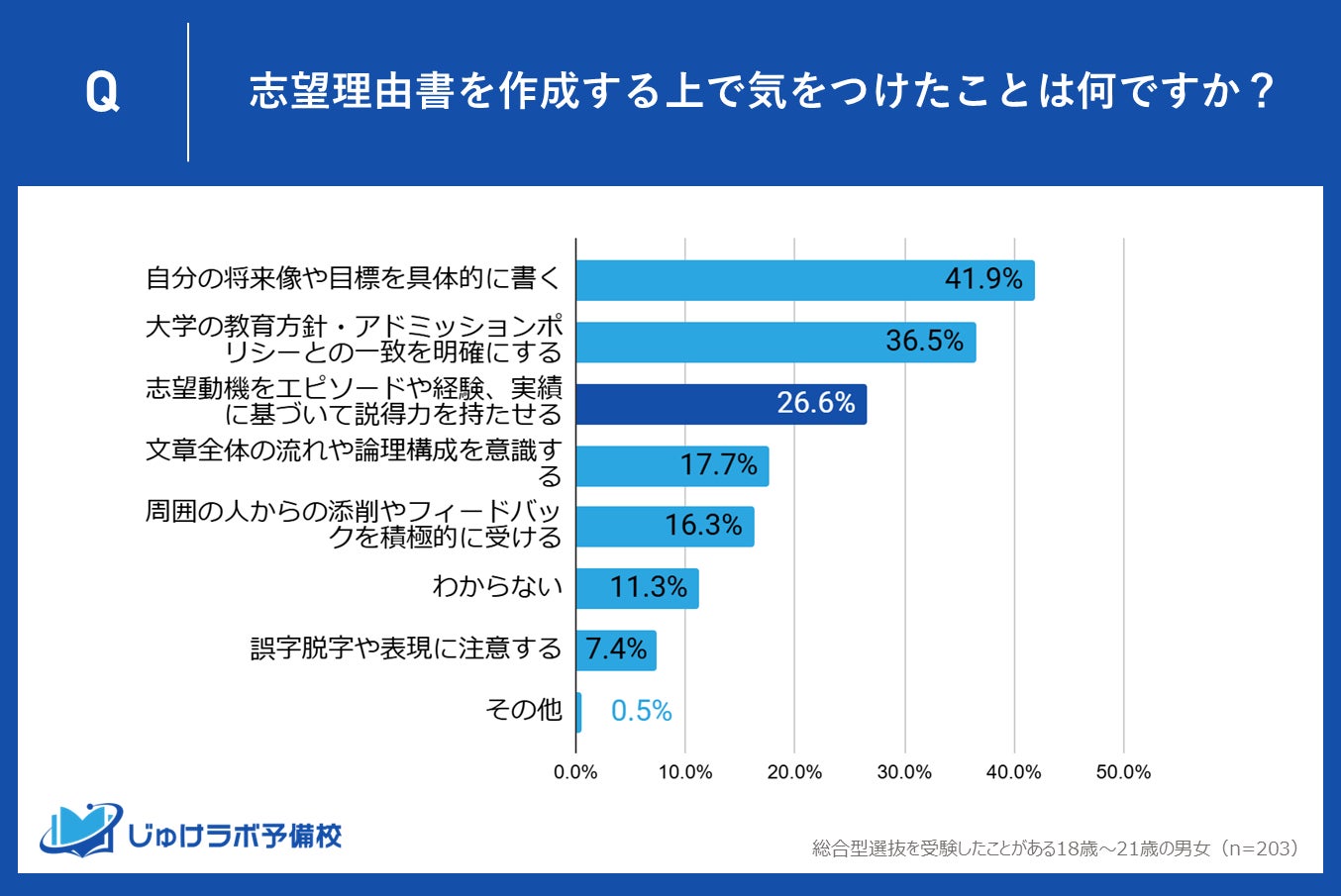 調査結果によると、26.6%の受験生が、志望動機を作成する際に実際のエピソードや経験、実績に基づいた記述を重視しています。受験生は、具体的なエピソードを通じて自身の成長や取り組みを示すことで、説得力のある志望動機を構築し、大学側に対して真摯な姿勢をアピールしています。大学側も、こうした具体性のある記述を評価する傾向があるため、この手法は受験生の強みを効果的に引き出す手段となっています。