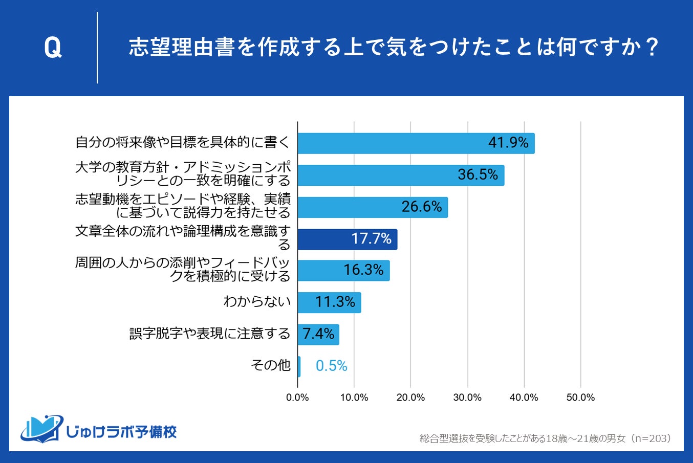 調査では、17.7%の受験生が文章全体の流れや論理構成に特に意識を向けていることが明らかになりました。志望理由の一貫性や論理的な展開は、受験生の思考の整理能力と表現力を反映し、読み手にとって理解しやすい文書作成に寄与します。大学側も、明確な論理構成を持つ文書を、受験生の高いコミュニケーション能力と分析力の表れとして評価するため、文章全体の整備は合否判断において重要なポイントとされています。