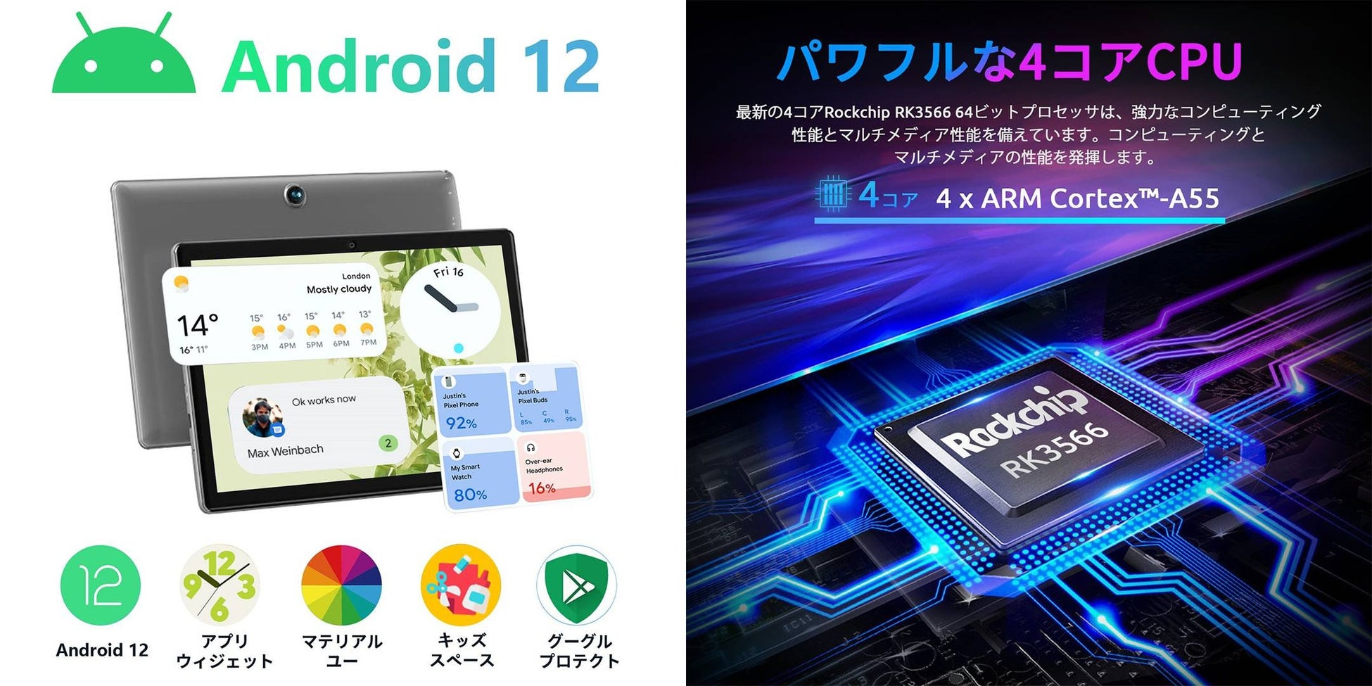 タブレットRK3566を搭載しています。4コアCPUは、高性能な「4*A55」搭載し、安定性が高くスムーズな処理を実現し操作がサクサクスピーディーに行えます。Android タブレットWIFI 6モデルは大容量4GBのRAM+64GBのROMで、写真、ビデオ、音楽を保存するのに十分なスペースも備えています。さらに、MicroSDカードを挿入すれば1TB容量を拡張可能です。これにより、高いパフォーマンスと高い電力効率を両立させています。