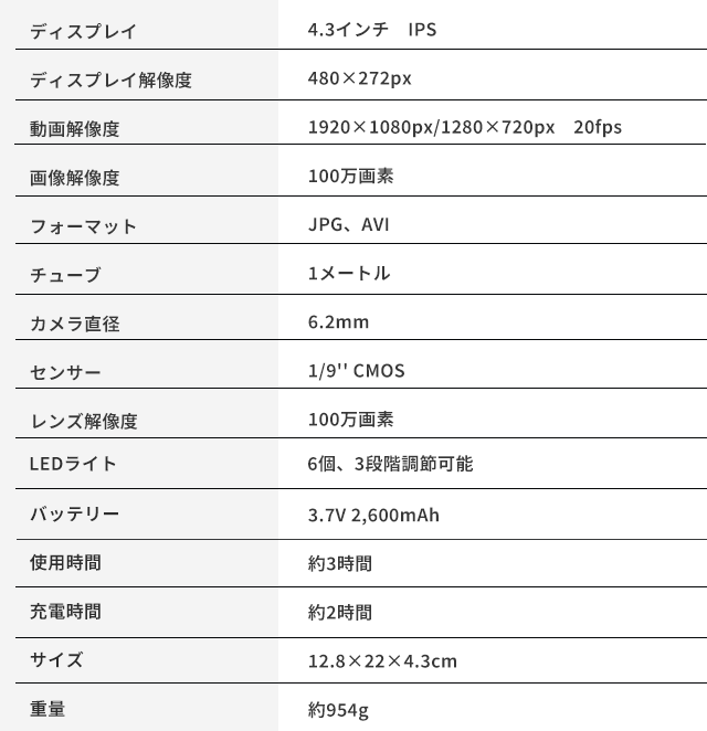【4.3インチ大画面・210°調節可能・極細カメラ6mm・IP67防水仕様】