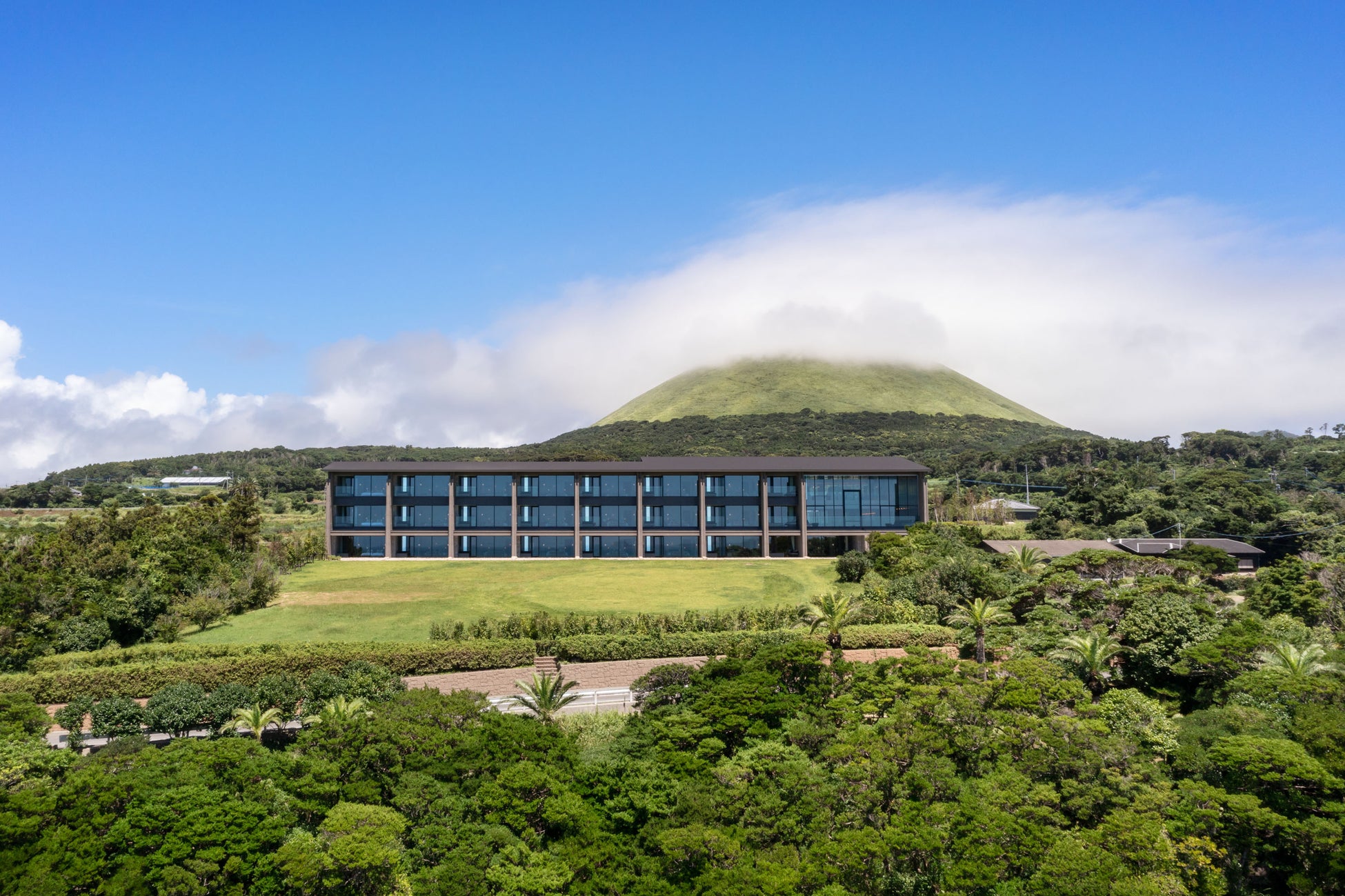 五島のシンボル「鬼岳」の噴火により形成されたとされる溶岩海岸を見下ろす高台に位置しています。内装設計とデザインを手がけた橋本夕紀夫氏がテーマに掲げたのは「The view」。どこまでも続く美しい海景、身体を包み込む海風。鐙瀬ならではのダイナミックで雄大な自然が主役となるようなデザインが、館内にちりばめられています。