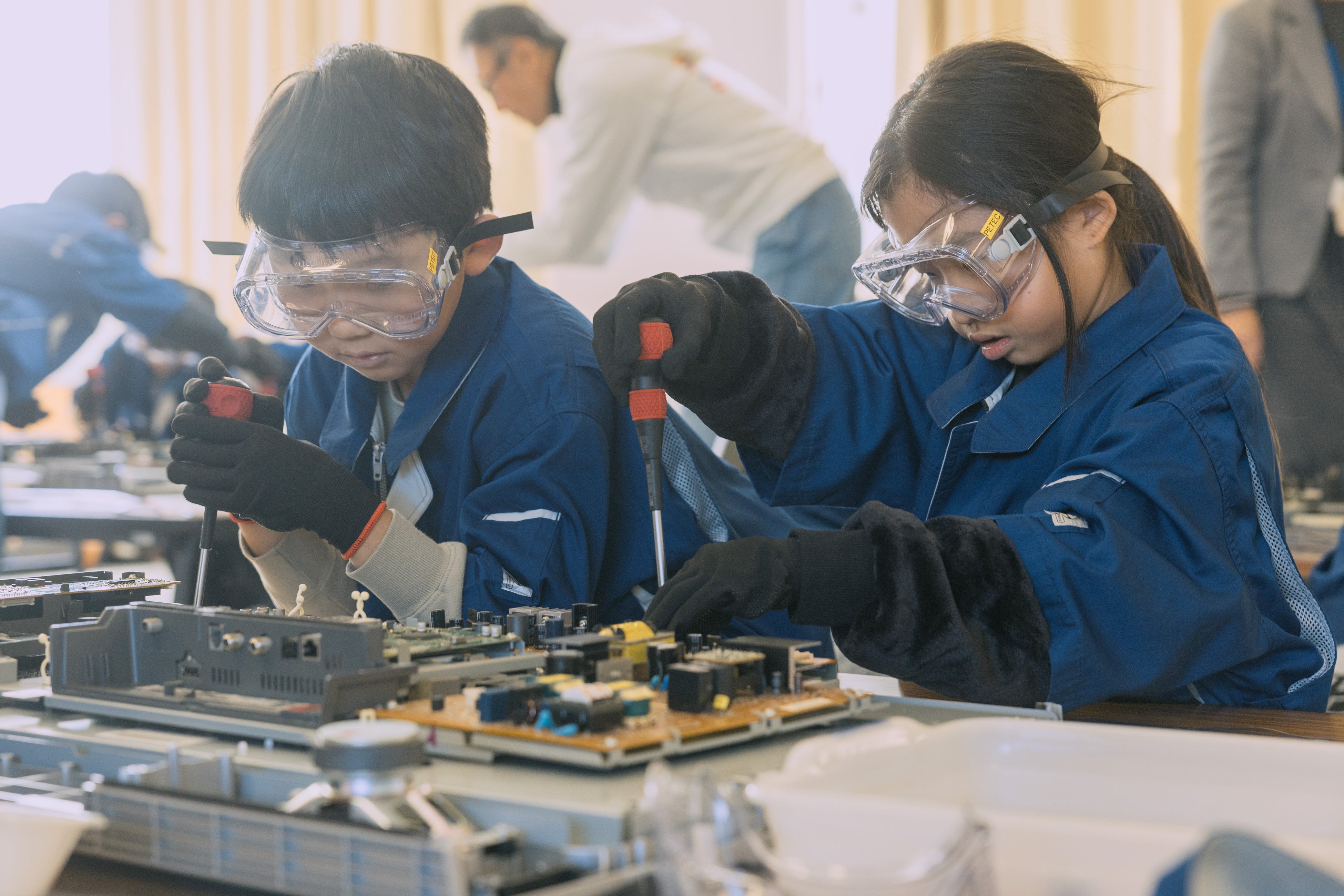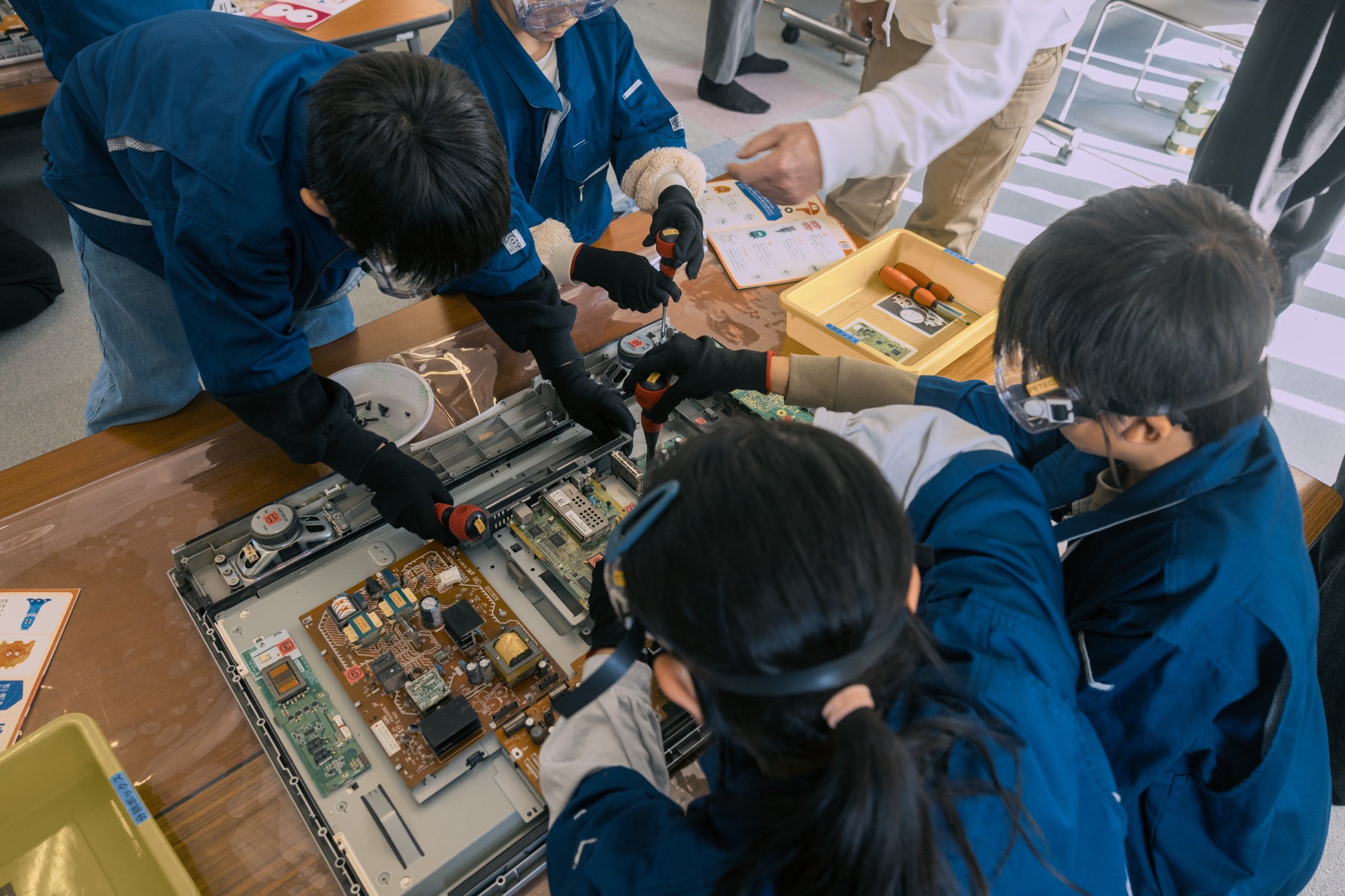 授業では、パナソニック エコテクノロジーセンター株式会社(PETEC)の協力のもと、テレビの解体を通じてリサイクル可能な部品を探すワークショップや、学校や家庭で実践できる脱炭素アクションを学ぶクイズ型学習を実施。体験を通じて、子どもたちが脱炭素を「自分ごと」として捉え、次の行動につながる気づきを得ることを目指しました。