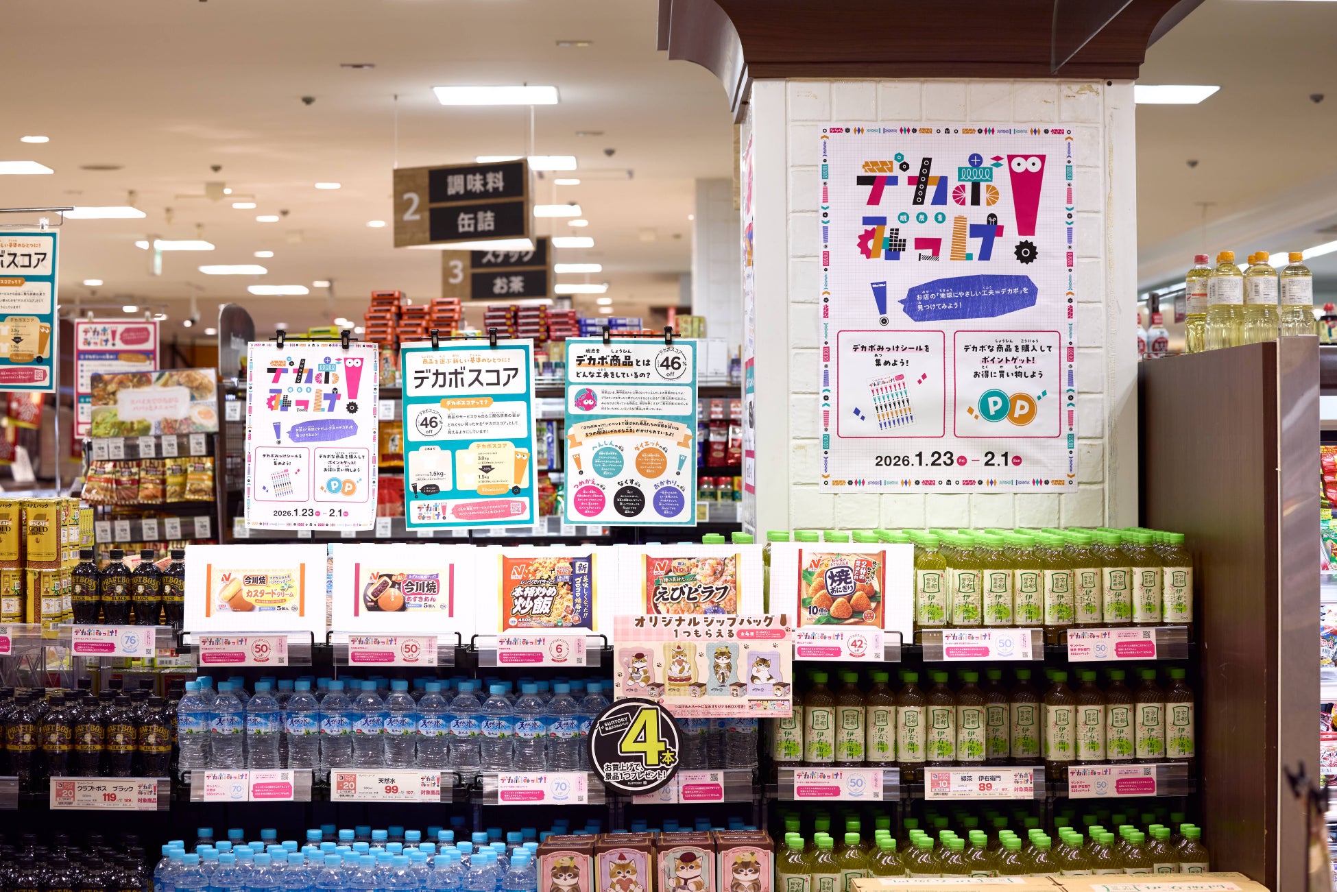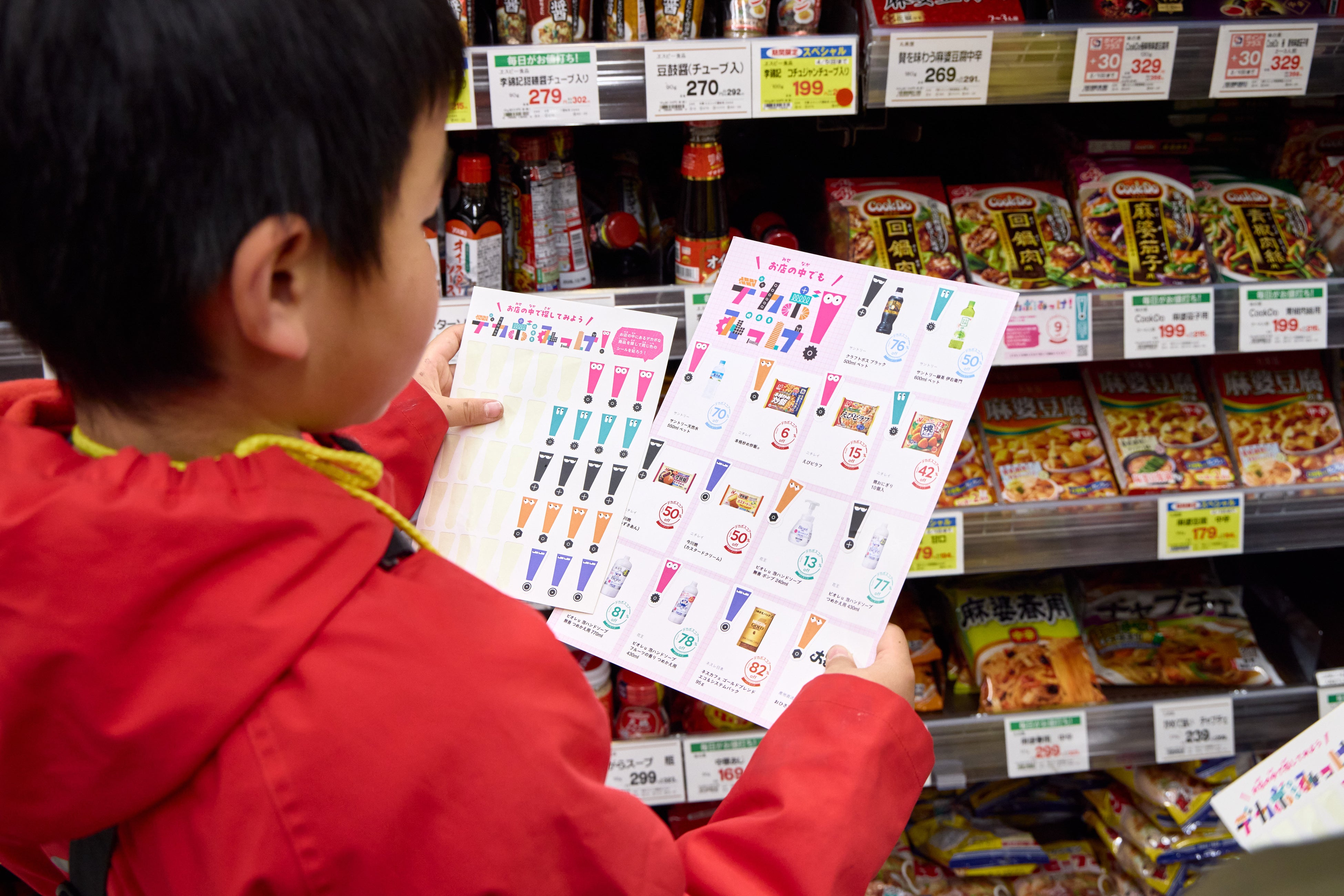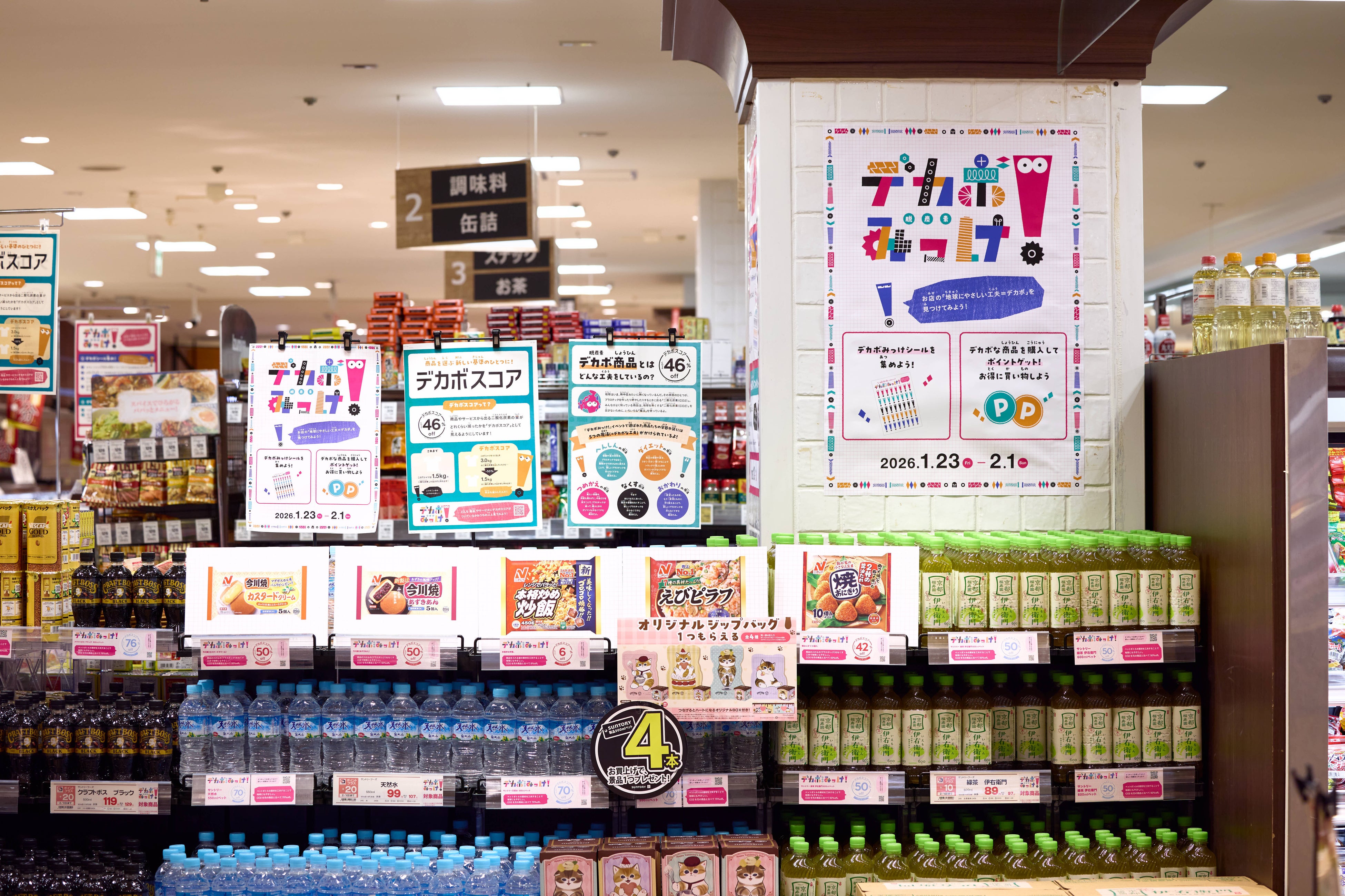 家庭での行動を社会との接点につなぐ場として、イズミヤショッピングセンター小林にて参加型施策を実施しました。デカボスコアが付いた商品を探してシールを集めるワークや、対象商品の購入に応じてSポイント(※)を付与するキャンペーンを展開しました。