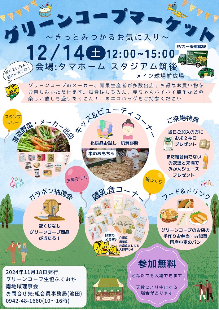 西日本を中心に16の生協で構成されている一般社団法人グリーンコープ共同体(本部:福岡市博多区、代表理事:日高容子、以下「グリーンコープ」)に所属するグリーンコープ生活協同組合ふくおか(以下、「グリーンコープ生協ふくおか」)は、環境や食について家族で楽しみながら学べるイベント「グリーンコープマーケット~きっとみつかるお気に入り~」を12月14日(土)に開催します。