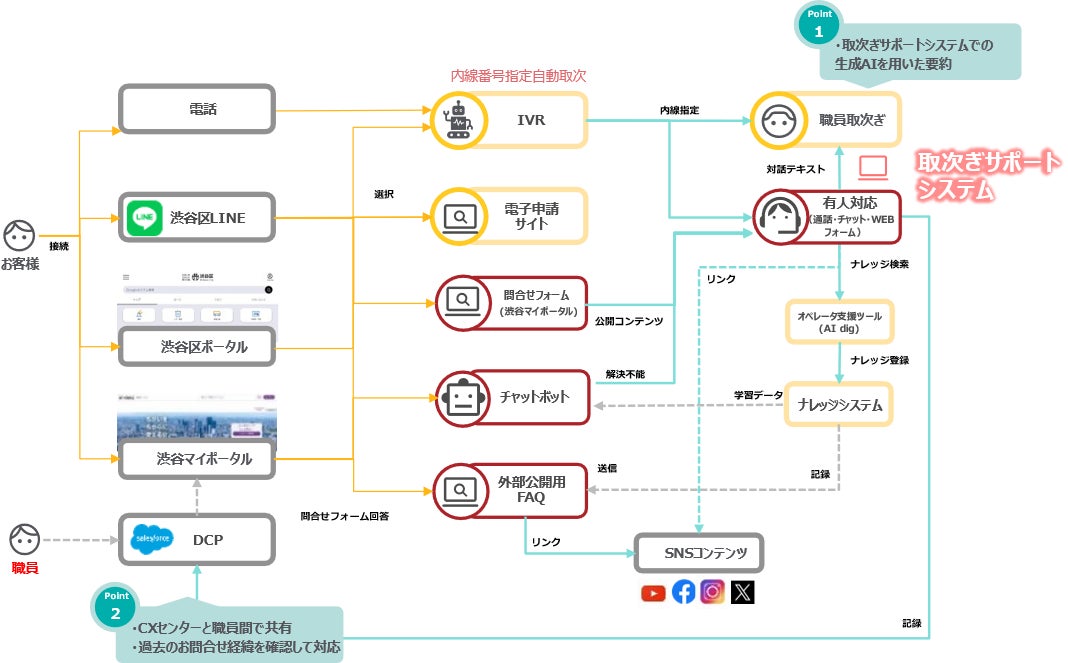 渋谷区デジタルコンタクトセンターの構築に向けた取り組みは、2024年1月から段階的に推進し、初期フェーズでは、「IVR※4の導入」「SMS送信サービス(Webページ・FAQなどデジタルコンテンツへ誘導する仕組み)の導入」「取り次ぎサポートシステム(通話内容のテキストデータ化)の導入」「KCS※5の導入」などを完了しました。これにより、住民からのコンタクトセンターへの様々な問い合わせについて、適切な所管課・デジタルコンテンツへ取り次ぎ・誘導する仕組みが整備され、また、各所管課とコンタクトセンターの連携が強化されたことで、問い合わせに対する回答情報の蓄積や問い合わせの増加が見込まれる内容の共有が活発になり、ナレッジを最大限活用することが可能になりつつあります。