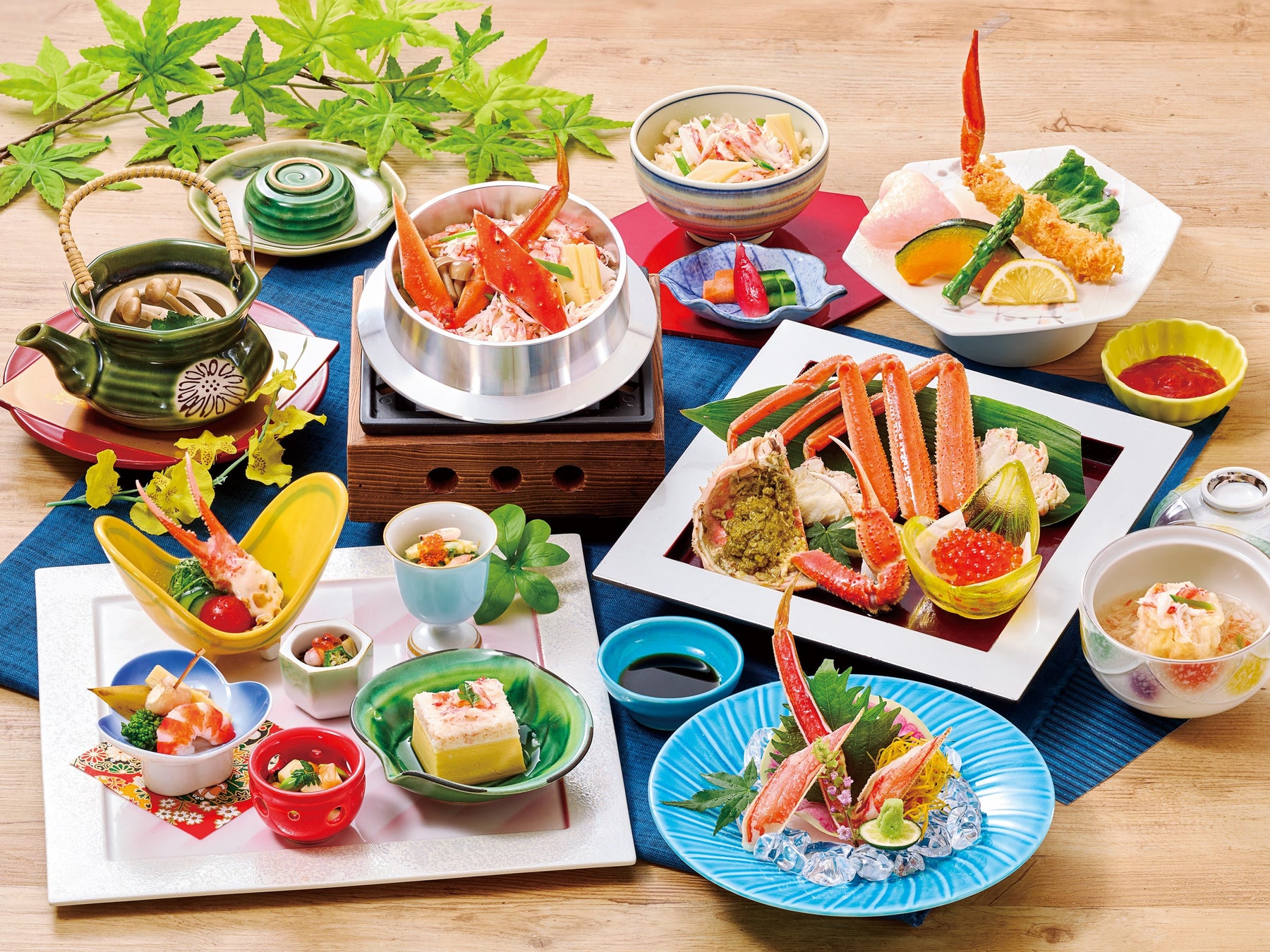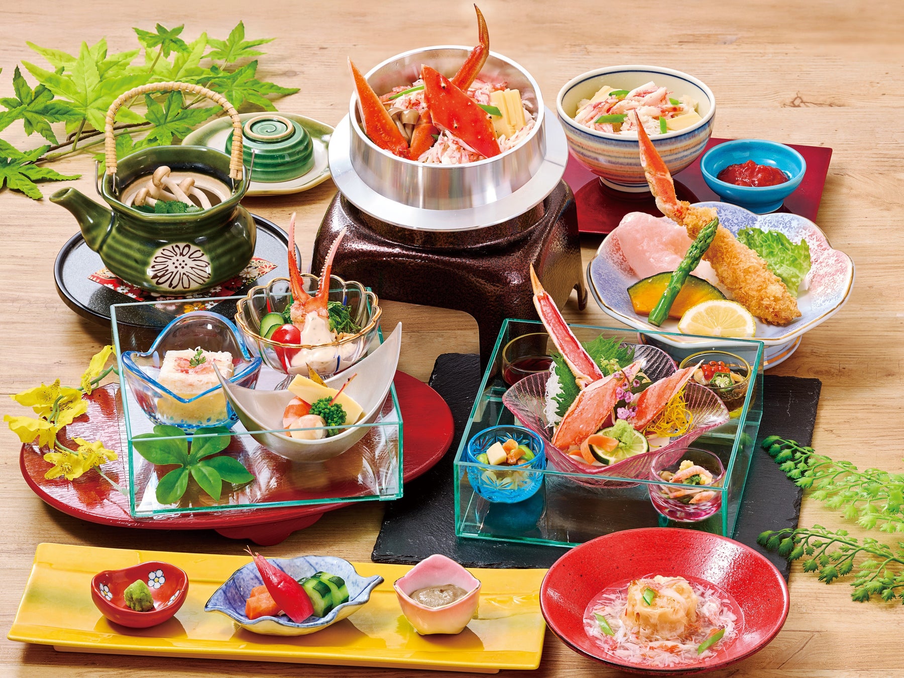 たらばとずわい釜めし、茹でがに半身盛り、彩り前菜プレート、かに刺身、かに餡かけシューマイ、かにフライ、香の物 ※特製出汁付き
