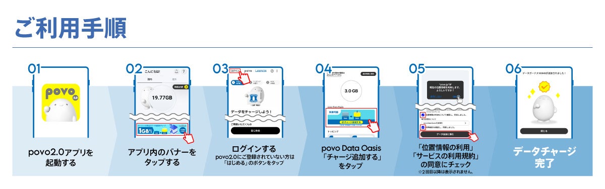 ローソン店内でpovo shopへアクセスし、povoアカウントでログインしてください。位置情報で来店状況を確認後、0.2GB(24時間)が即時で追加されます。