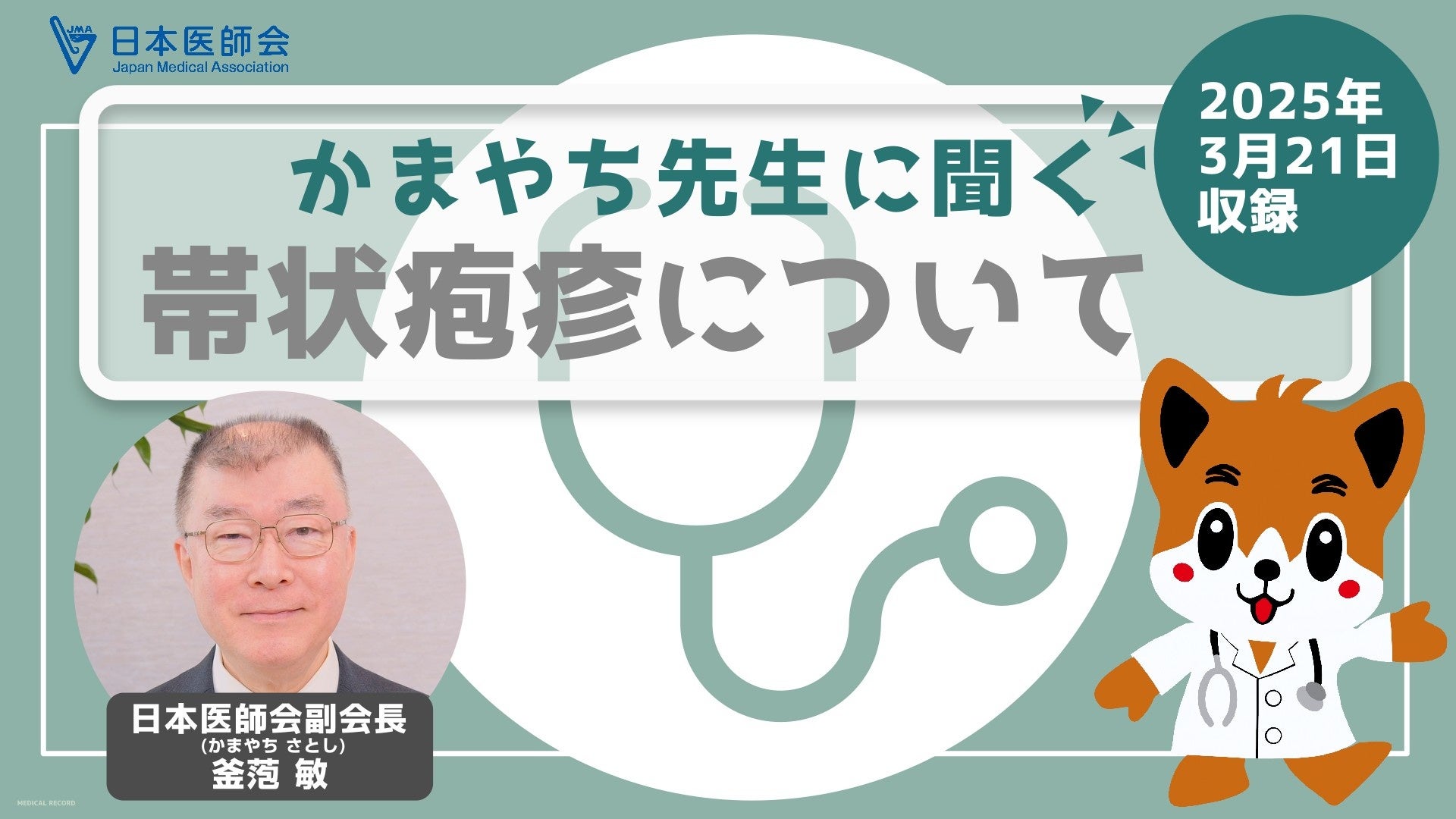 日本医師会(会長:松本吉郎)は4月10日、公式YouTubeチャンネルで動画「かまやち先生に聞く 帯状疱疹について」を公開しました。