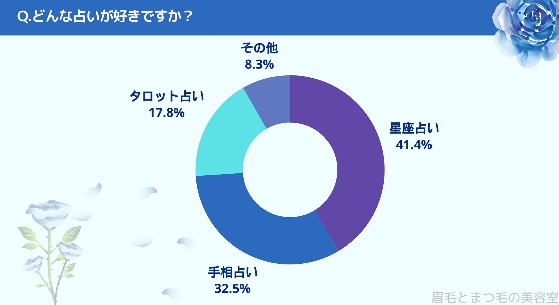 どんな占いが好きかお聞きしたところ「星座占い(41.1%)」、「手相占い(32.5%)」、「タロット占い(17.8%)」、「その他(8.3%)」という結果になりました。