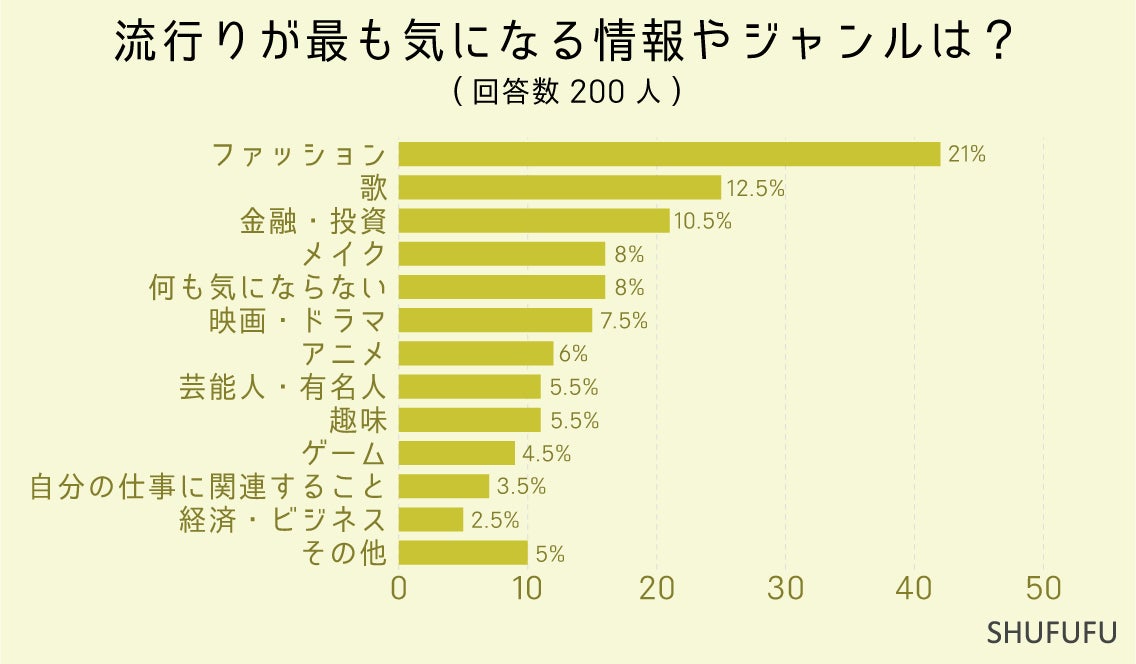 流行りが最も気になる情報やジャンルを尋ねたところ、1位は「ファッション(21%)」、2位「歌(12.5%)」となりました。ファッションや歌の流行りは日常生活でも取り入れやすく話題にもなりやすいので知っておくと良さそうですね。