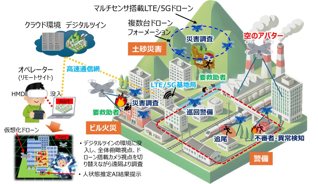 近未来のスマートシティーでは通信網で通信接続された複数台の遠隔ドローンを用いて、自律的またはリモート操作による防災、警備、点検などでの活用が想定されます。現状では防災や警備などの迅速な対応を要する現場でドローンを活用する場合、操縦者が近距離においてドローンからの映像を確認しながら1台のドローンを操縦し、操縦者あるいは補助者がドローンからの映像を見て被災状況の把握を行っていますが、労働力不足のなか高度なドローン運用が可能な多数の専門要員確保が課題となっています。飛行中に得られる映像からAIにより人などの状態を推定し、XRなどで提示された情報から、特に不審者や要救助者の識別が可能となれば、操縦者および補助者の負荷は大幅に軽減でき、安全かつ効果的なドローン運用と効率的な警備や救助活動などが期待できます。
