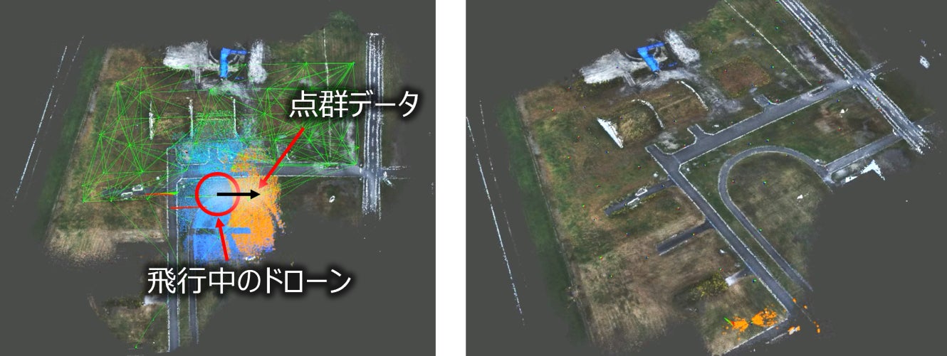 【技術のポイント】飛行中の複数ドローンから地上をLiDARセンサーでスキャンし、GPS情報を併せて取得した点群をつなぎ合わせることで高精度な3次元の環境モデルを作成します。同時に、カメラからのカラー画像を用いてドローン搭載コンピューター上で点群のカラー化まで処理します。地上対象物の少ない環境、揺れの大きなドローンから安定した3次元カラー点群の生成を実現しています。