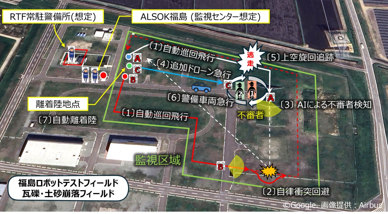 今回開発した革新的ドローンリモート技術の機械警備※9への応用を検証するため、2024年10月16日~18日および12月4日~6日に、ALSOK福島株式会社の協力のもと、福島ロボットテストフィールドにおける従来の機械警備を拡張する3台のドローンを活用した警備運用シナリオ(図2〔1〕~〔7〕)に沿って、以下の実証を行いました。