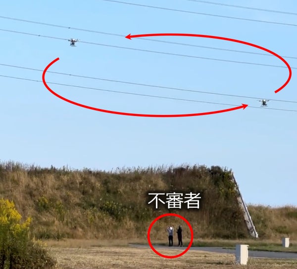 3)複数ドローンによる死角のない不審者上空旋回自動追跡(図2〔4〕、〔5〕)