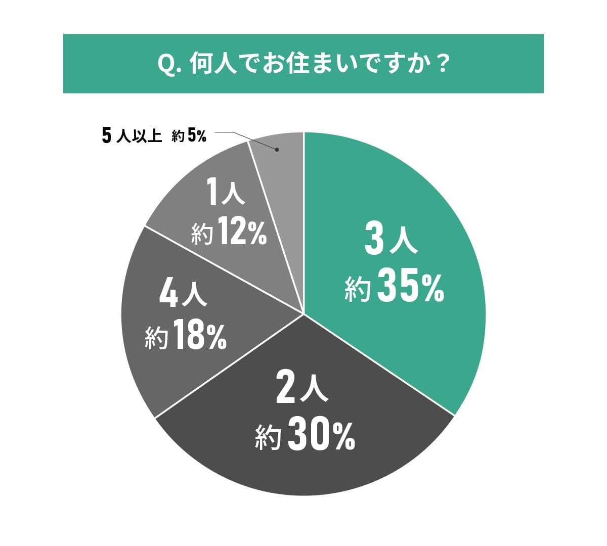 3人世帯が最も多く、2人世帯が続きます。3人と2人世帯で全体の約66%を占めています。家族構成によって収納スペースへのニーズが異なることが予想されます。