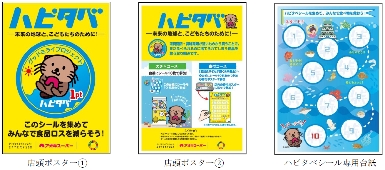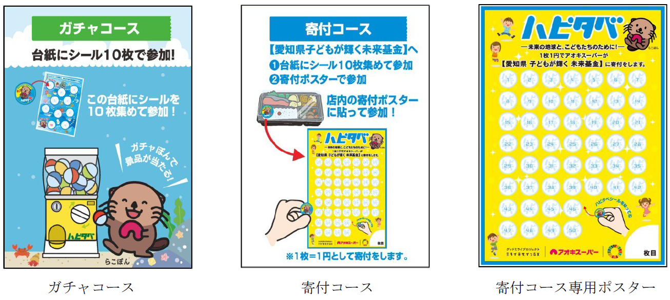 専用台紙に『ハピタベシール』を10枚貼って寄付箱へ投函するか、店頭に掲示してあるポスターにシールを貼っていただくことで、シール1枚につき1円を当社が『愛知県子どもが輝く未来 基金(*)』へ寄付いたします。