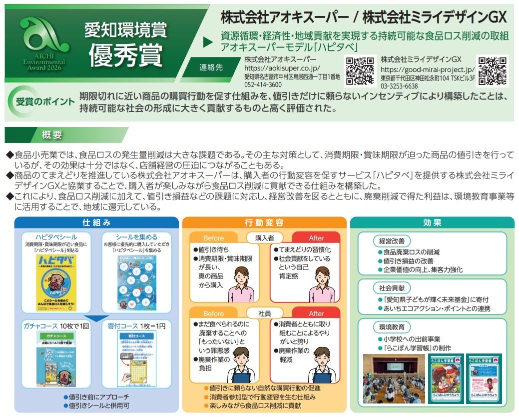 株式会社アオキスーパーが、2023年10月より全店で実施している食品ロス削減と地域貢献活動の取り組み『ハピタベ』(提供:株式会社ミライデザインGX)が 2026 愛知環境賞の『優秀賞』を受賞し、愛知県知事出席のもと2月17日(火)に開催された式典にて表彰されました。