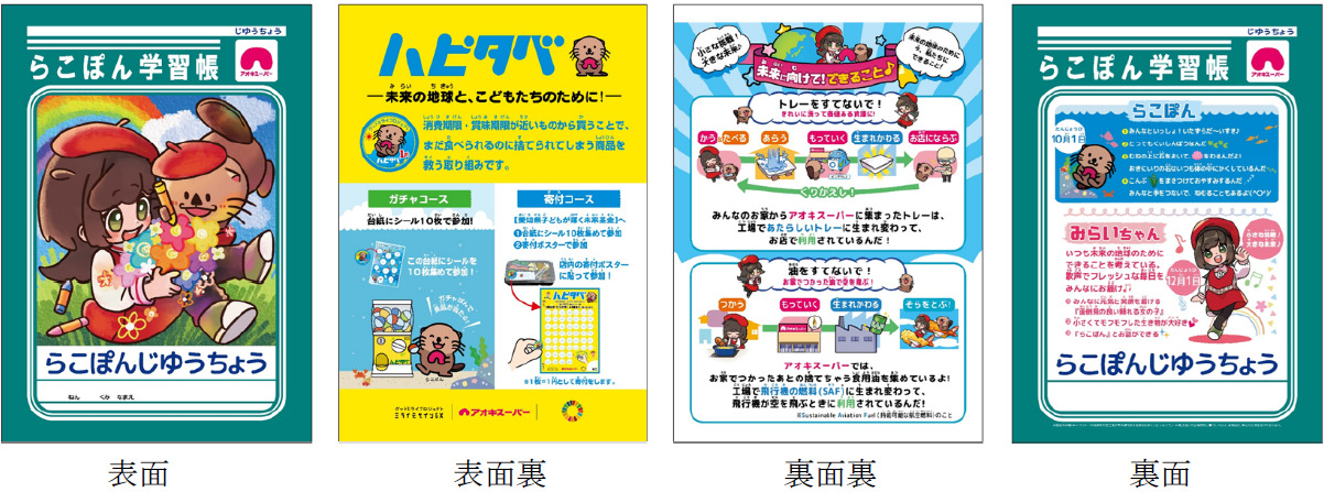 当社では、子ども達が身近に環境問題を意識しつつ、より一層楽しみながら学ぶことができる よう、それぞれの授業のテーマ(食品ロス削減・食品トレーのリサイクル・廃食用油のリサイクル)について分かりやすくまとめた『らこぽん学習帳』を制作し、出前授業で活用しています。