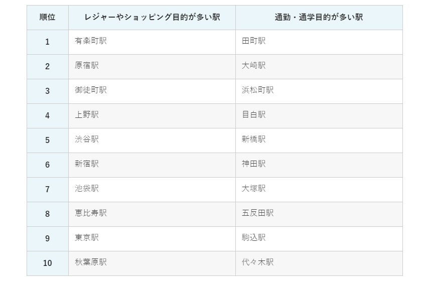 2位には20代以下の利用が多い「原宿駅」が、3位と4位にはアメ横の最寄り駅である「御徒町駅」と「上野駅」が入り、5位以下には「渋谷駅」「新宿駅」「池袋駅」というターミナル駅が並びました。