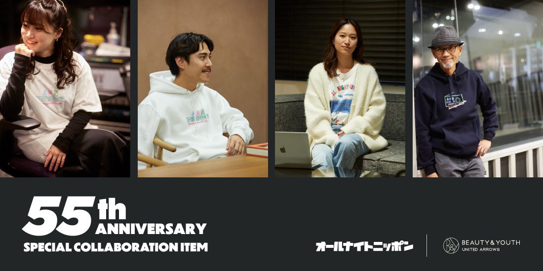 株式会社ユナイテッドアローズ(所在地:東京都渋谷区、代表取締役 社長執行役員 CEO:松崎 善則)が展開する「ビューティ&ユース ユナイテッドアローズ」(以下、BY)は、ラジオ番組「オールナイトニッポン」の放送55周年を記念したコラボファッションアイテム7種を企画しました。11月19日(土)より「ユナイテッドアローズ オンライン」と「ZOZOTOWN」にて予約受付を開始いたします。