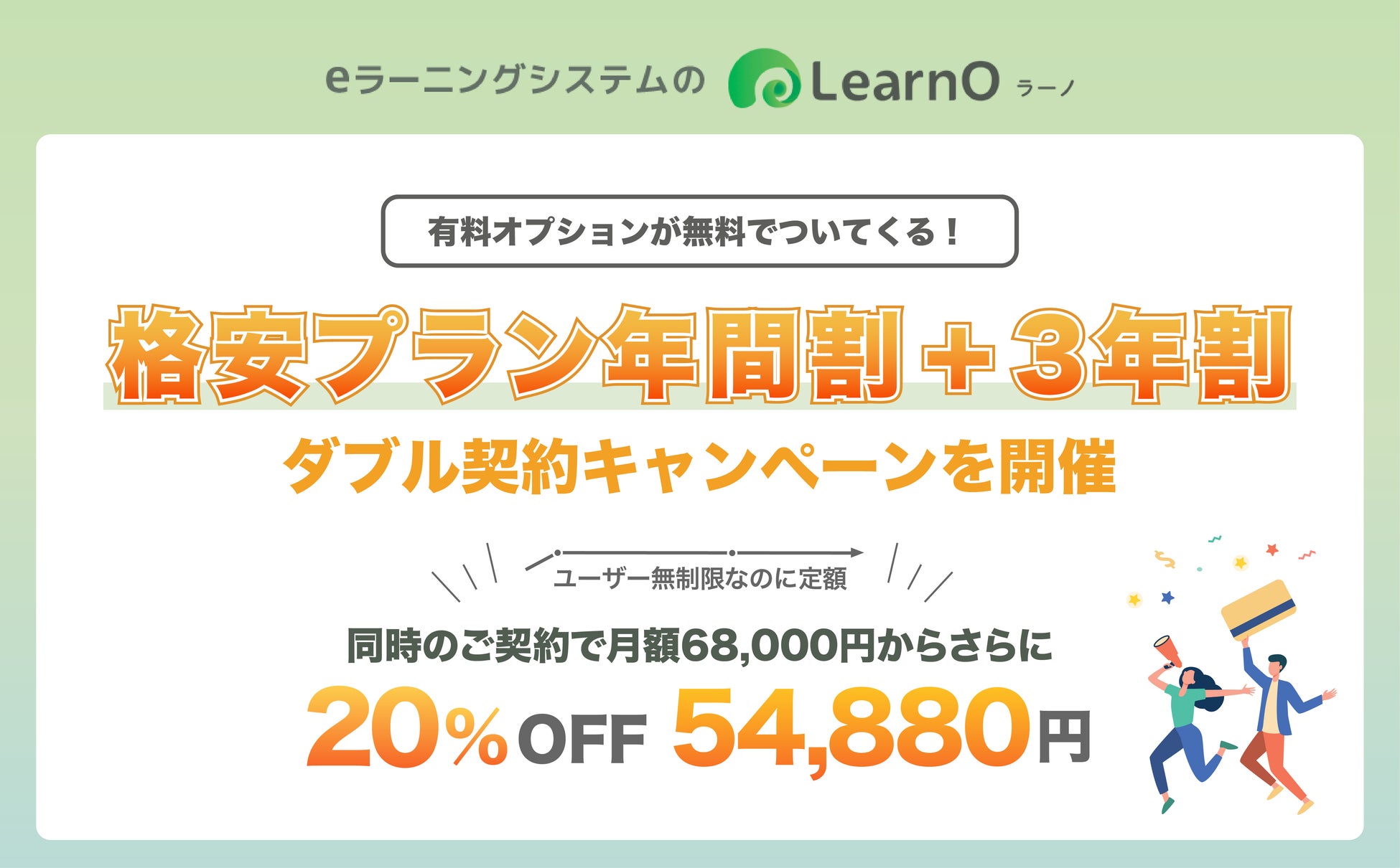 ユーザー無制限、月々54,880円、業界最安値帯。eラーニングシステム「LearnO(ラーノ)」の「格安プラン年間割」×「3年割」同時お申込みキャンペーン
