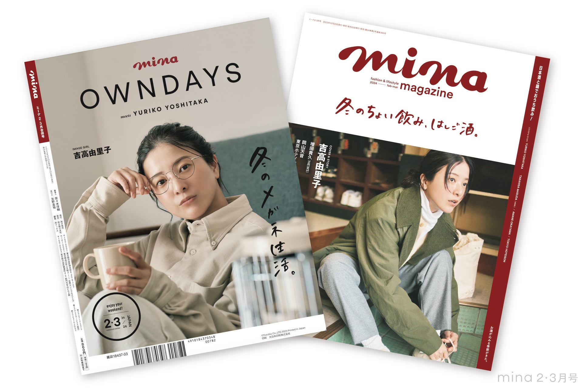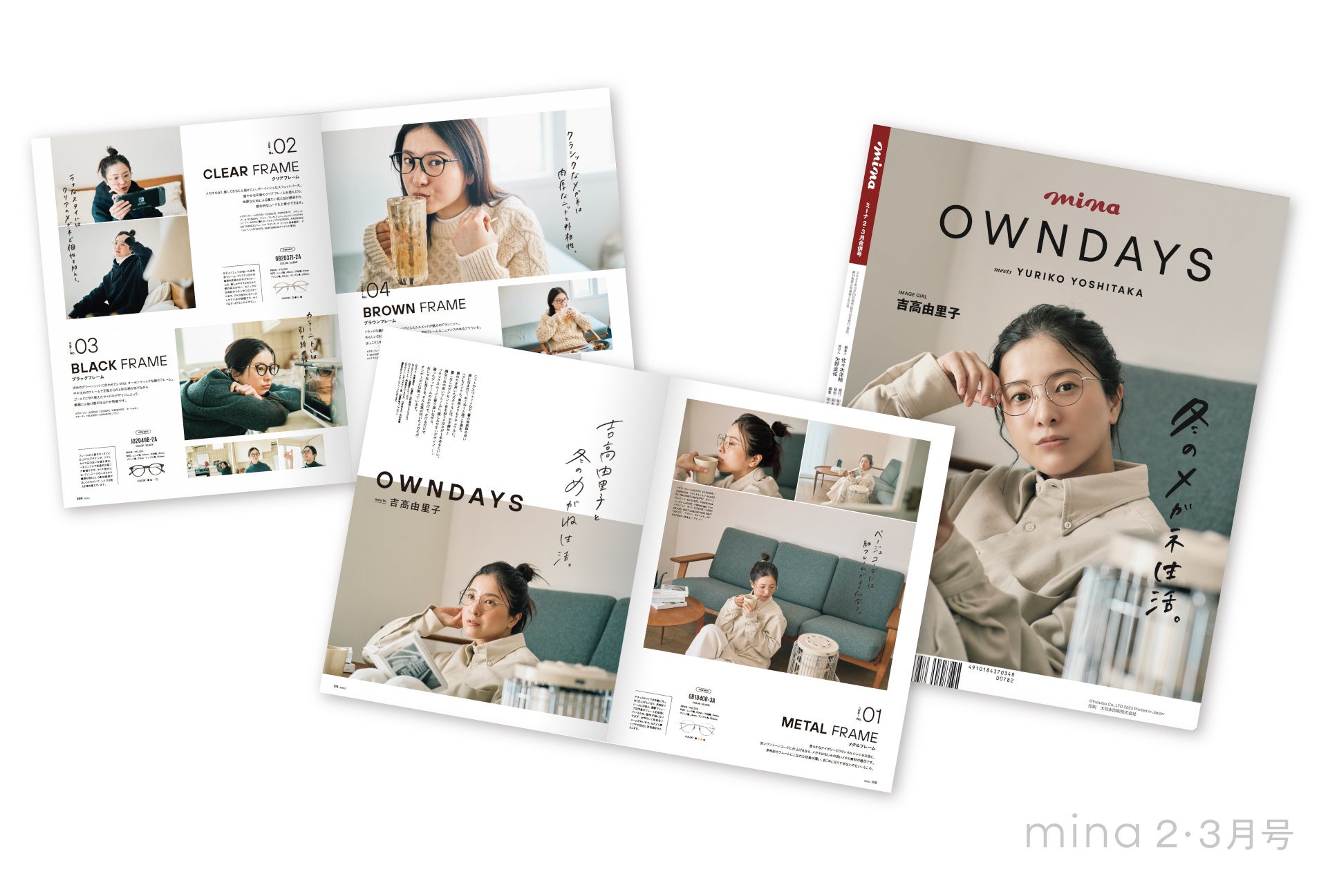 この度、 メガネ・サングラスの製造販売を手掛けるOWNDAYS株式会社(本社:沖縄県那覇市、代表取締役社長:田中修治)は、2023年12月20日(水)発売の女性ファッション誌「mina 2024年2・3月号」タイアップにて、女優・吉高由里子さんをモデルに、この冬の着こなしのアクセント役を担うメガネを紹介します。本誌では、裏表紙も吉高由里子さんが飾っており、冬を感じる淡いワントーンのコーデにメタルフレームを合わせたメガネ姿を披露しています。普段のお仕事の雰囲気とは変わって、お家でぬくぬく過ごす吉高さんの姿は必見です。誌面では、メタルフレームの他にも存在感のある黒縁フレームや、軽量素材でずれにくい鼻パッドを採用したフレームなど、日常生活でも使いやすいメガネを多数紹介しています。掲載された商品は、OWNDAYSの店頭及び、オンラインストアにて購入いただけます。