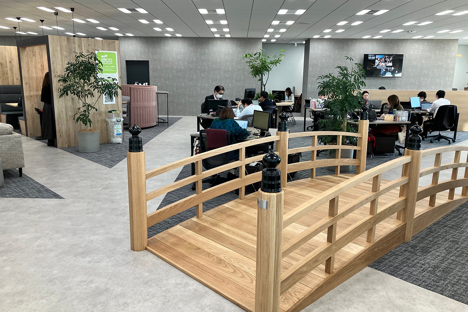 社員が働きやすい環境と共に、お客様やパートナー様との交流を促し、様々なアイデアを生み出すための空間を広く設けました。快適で解放感に溢れる環境で、セミナーやイベントも開催できます。執務エリアには日本橋に因みリアルな橋を設置し、エンターテインメント性を加えました。移動時に触れる木の素材感は気持ちを切り替えるきっかけにもなります。大小様々な形のミーティングスペースや集中して業務を行える半個室ブースなども設け、業務内容や気分に応じて働く場所や時間を自由に選択できるABW*⁴にも取り組んでいます。
