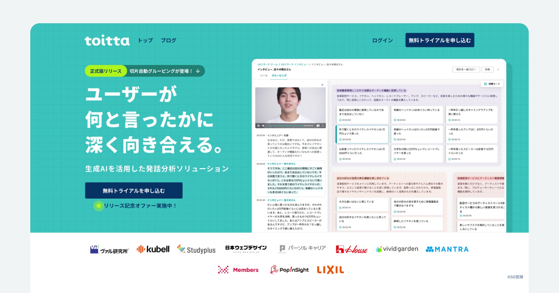 「toitta」は、デザインリサーチやマーケティングリサーチなどのインタビュー結果の分析プロセスを支援する、生成AIを活用した発話分析ソリューションです。