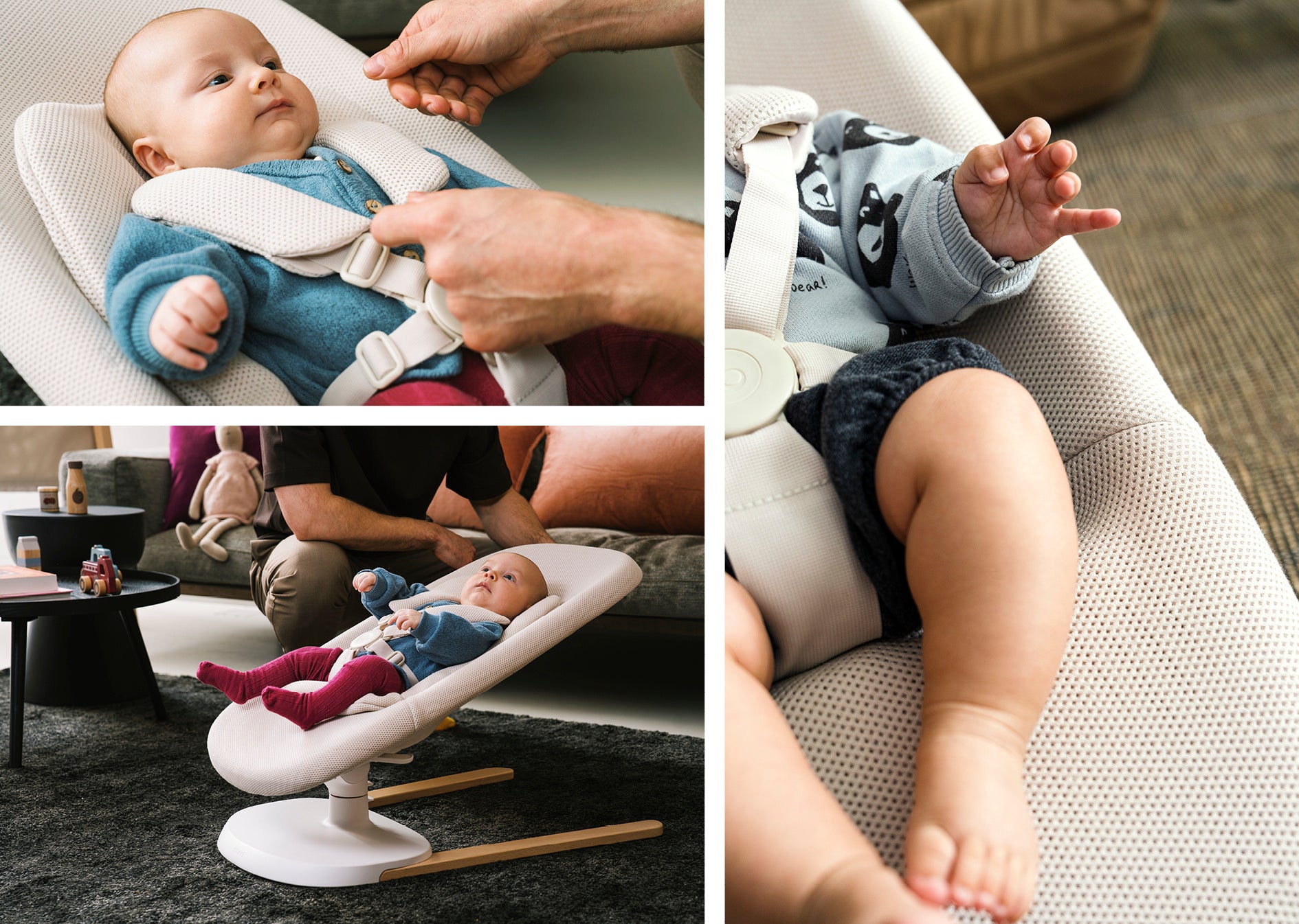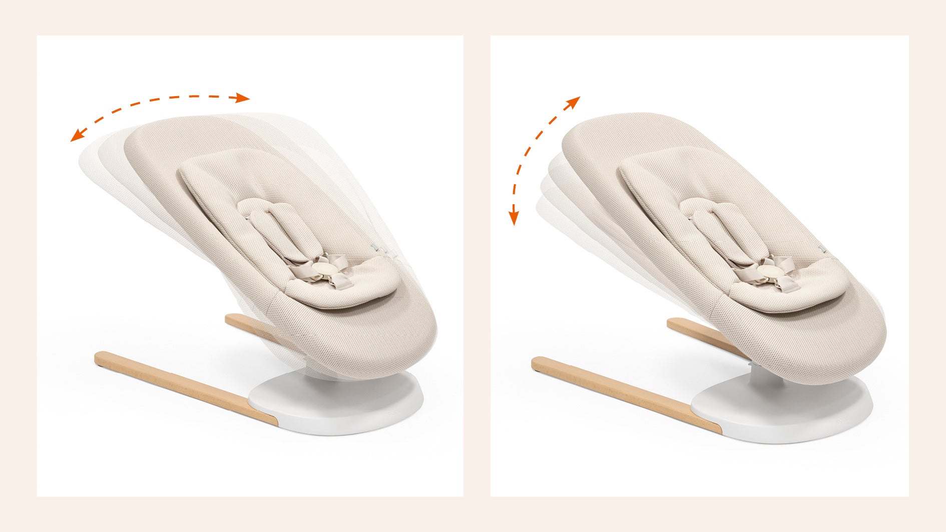 ストッケ ヨガ ベビーバウンサーは、 デザインおよび製造過程で、理学療法士らプロのアドバイスを受けながら開発されました。お子さまを抱っこするときに、無意識に使い分けている2つの動きに着目。お子さまの笑顔を引き出す縦揺れと、落ち着きを求める時の優しい横揺れを1台で再現する自立式バウンサーです。1つの製品で2つの動きを楽しめるこのバウンサーは、お子さまをあやすだけでなく、動きに応じて適度な刺激を与えることもできる、優れもの。お世話する方の手によっても、お子さま自身の動きによっても、2つの異なる動作をもたらす事ができます。