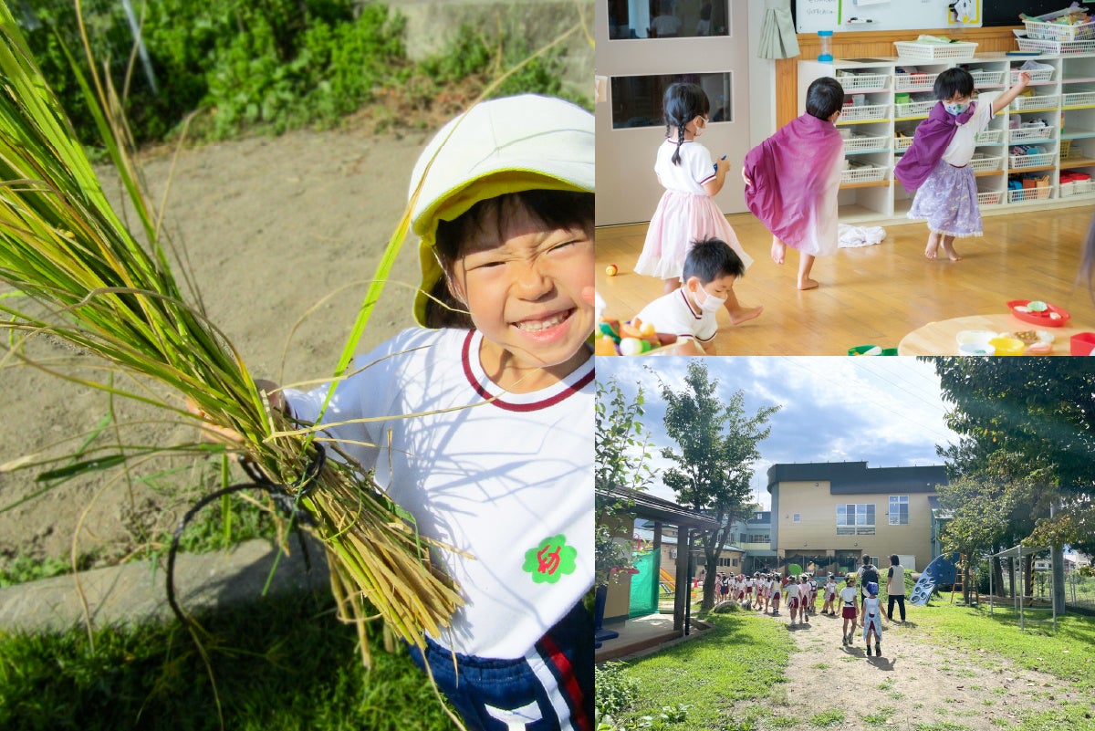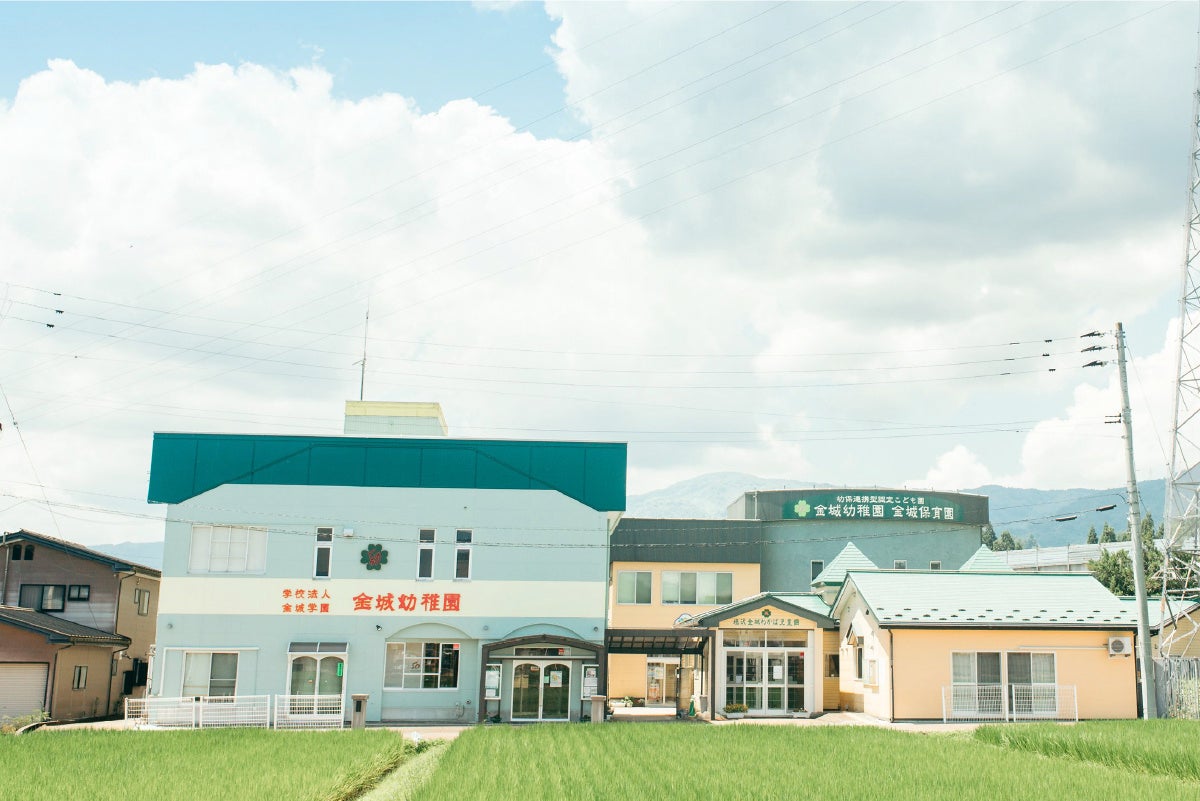 金城幼稚園・保育園でのこどもたちは、田んぼを身近に感じながら五感を育む体験をします。お米づくりは大事な体験のひとつ。「魚沼産コシヒカリ」の中でも最高級の「塩沢産コシヒカリ」を田植えから稲刈り、精米、ぬか釜で炊いて食べる過程を季節ごとに味わいます。また、こども園は、広い園庭、クライミングウォールのある児童館などが充実。冬にはスキー体験などを行い、季節と自然を感じながら遊びます。