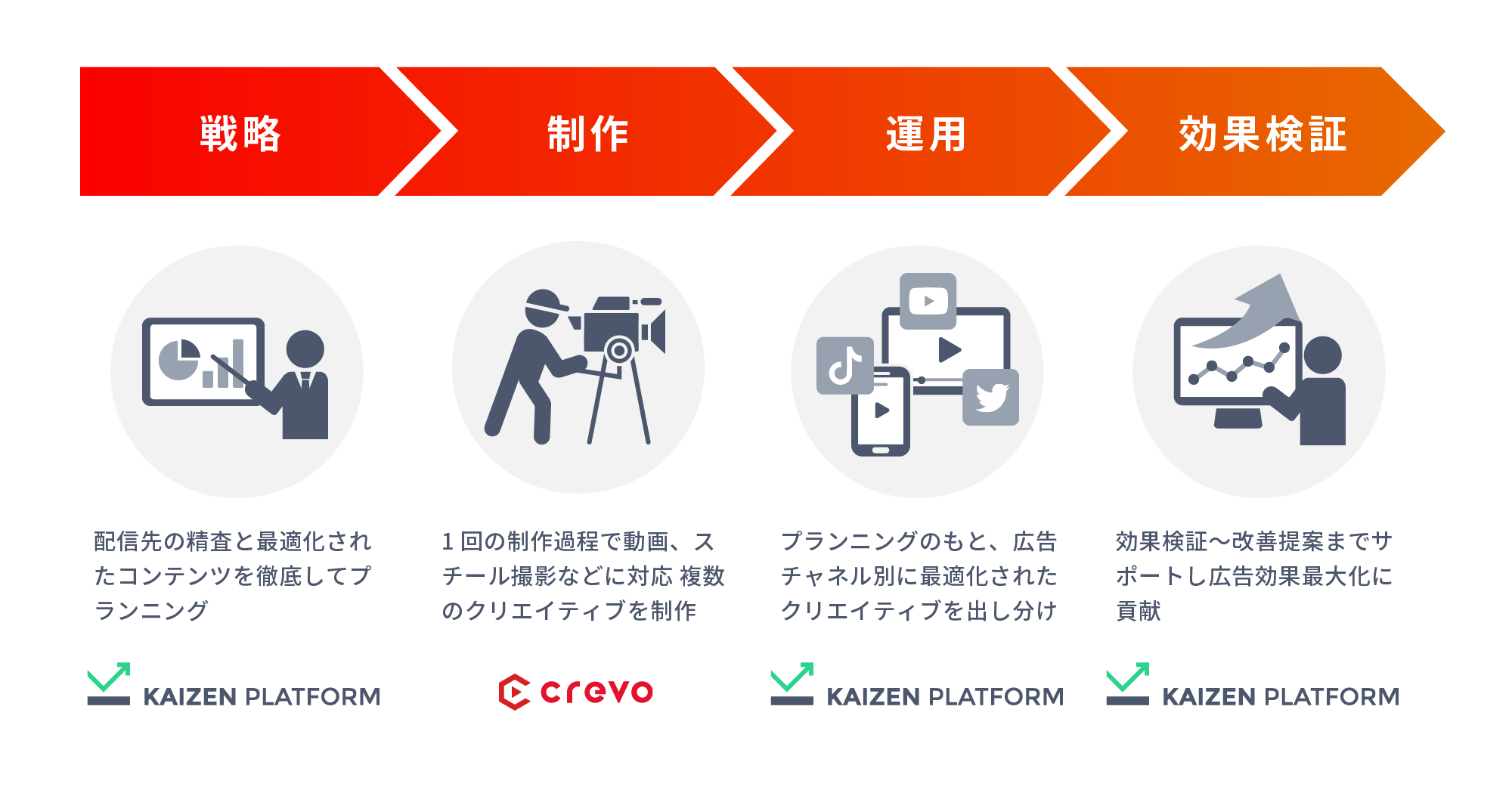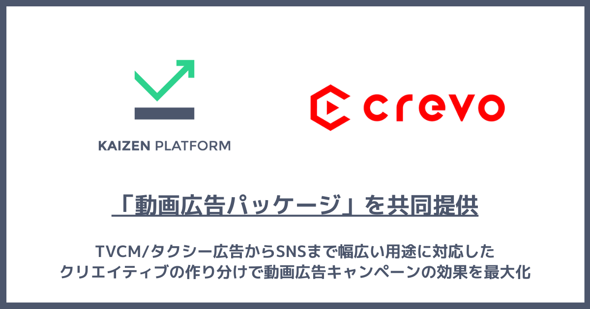 日本最大級の動画制作プラットフォームを運営し、大手企業からスタートアップまで2000社以上の制作実績を誇るCrevo(クレボ)株式会社(本社:東京都目黒区、代表取締役:柴田憲佑、以下「Crevo」)と、 目的や配信先に合わせた動画クリエイティブの編集により、広告効果の改善に強みを持つ株式会社Kaizen Platform(本社:東京都港区、代表取締役:須藤 憲司、以下「Kaizen Platform」は、共同パッケージ「Kaizen Platform×Crevo 動画広告パッケージ」の提供を開始します。