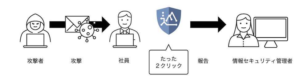 Gmail、Exchange Onlineでのアドオンを提供しているため、不審なメールを受信した際は、わずか2クリックで情報システム担当者に報告できます。