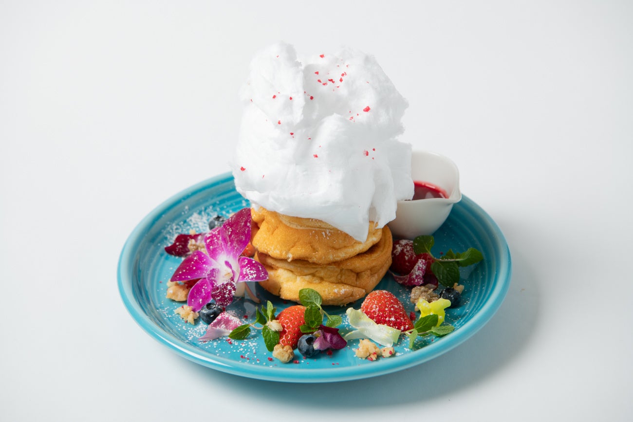 ヴィーナスフォートの空に浮かぶイメージ。焼きたてのパンケーキにふわふわのコットンキャンディーをトッピング。ソースで雲を溶かすと中から何かが・・・!!
