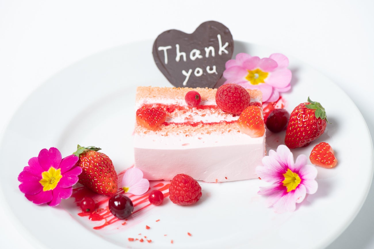 苺風味のショートケーキに苺のクリーム、苺ジャムをサンドしたショートケーキ。周りには苺、クランベリー、食用花で彩り、Venus GRANDの赤をイメージした一品です。
