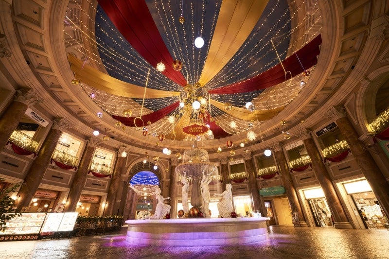 全てのお客様へ22年間の感謝を込めた心温まるイルミネーションを館内各所にて展開しています。噴水広場は、ゴールドと赤をキーカラーとしたドレープとライトでドーム型の吹き抜け天井を飾り、フィナーレに相応しい華やかな演出でお迎えするとともに、「Thankful Carnival Show」と題し、30分毎に約3分間のショーを展開。誰もが笑顔になるような、心に響くハートフルなショーを繰り広げます。