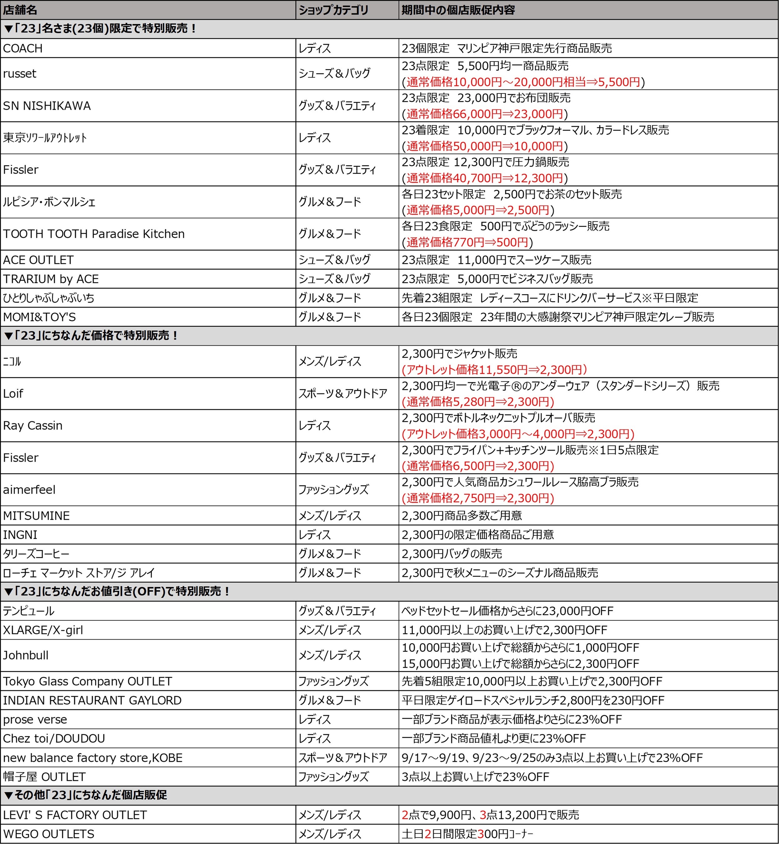 23年間のご愛顧に感謝を込めたセールとして、2022年9月14日(水)~10月2日(日)の期間、「三井アウトレットパーク マリンピア神戸 23年間の大感謝祭」を開催いたします。約40店舗が参加する23年の歴史にちなんだ「23」に関係するキャンペーンの開催をはじめ、各店舗おススメのコーディネートが2,300円(税込)でお楽しみいただけるキャンペーンなど、おトクなチャンスが目白押しです。そのほかにも、マリンピア神戸限定ノベルティのプレゼントや、マリンピア神戸限定価格のアイテムの登場など、おトクにお買い物をお楽しみにいただけるほか、ご家族でお楽しみいただけるイベントも多数開催いたします。