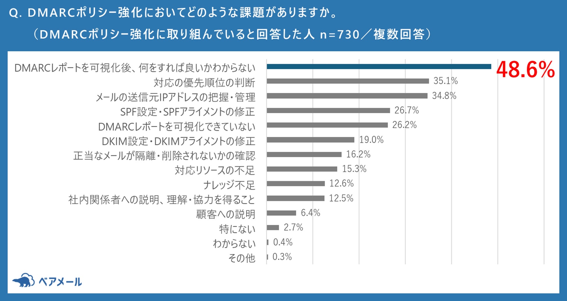 DMARCのポリシー強化の課題について、約半数が「DMARCレポートを可視化後、何をすれば良い