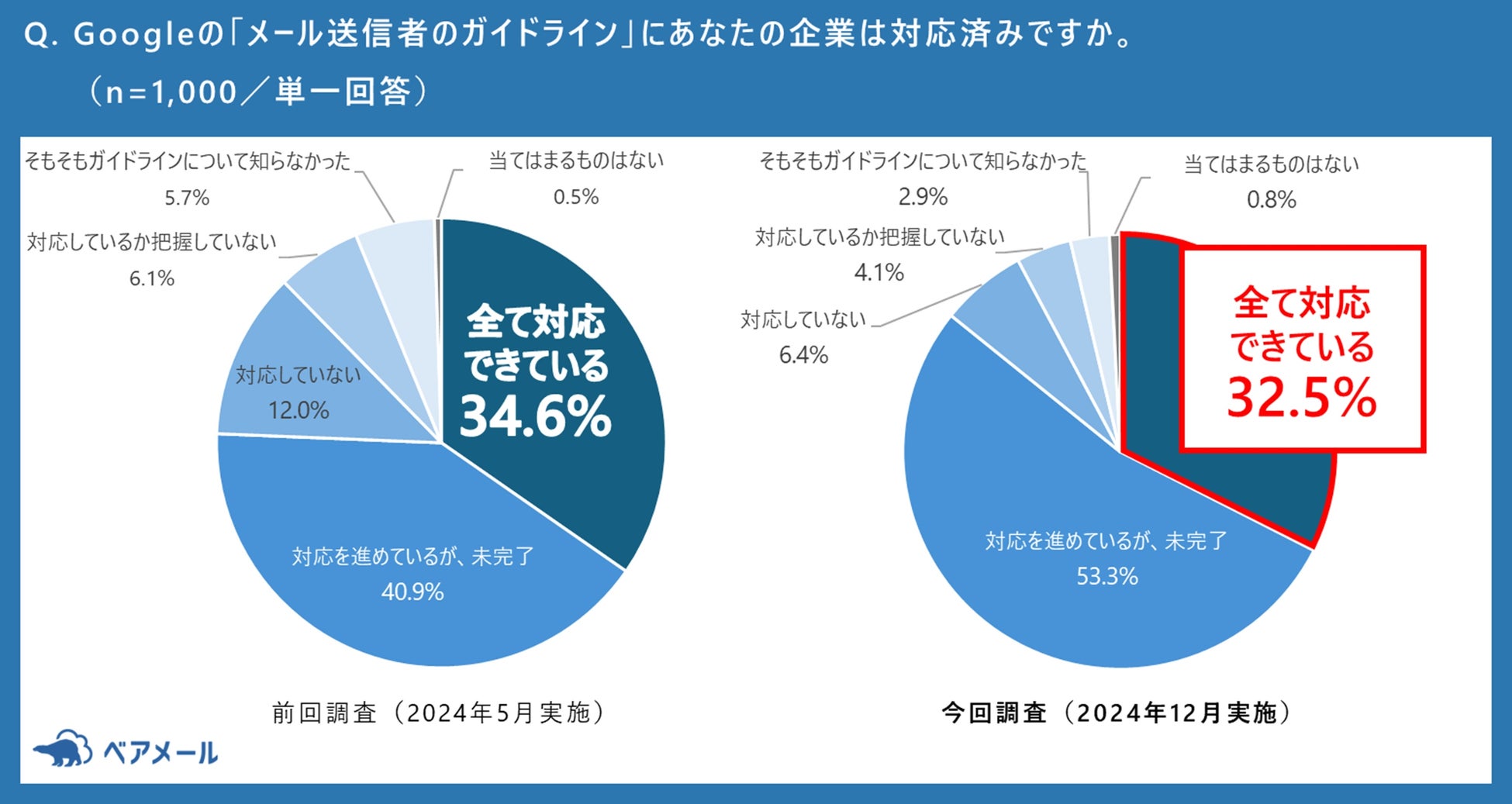 Googleのメール送信者のガイドラインに「全て対応できている」と答えたのはわずか32.5%。