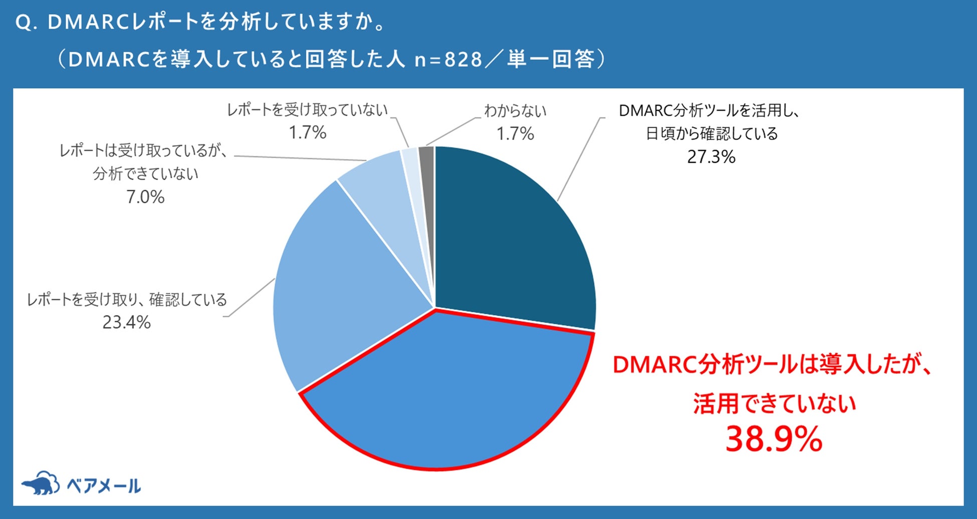 DMARCレポートの分析状況については、38.9%が「DMARC分析ツールは導入したが、活用できて