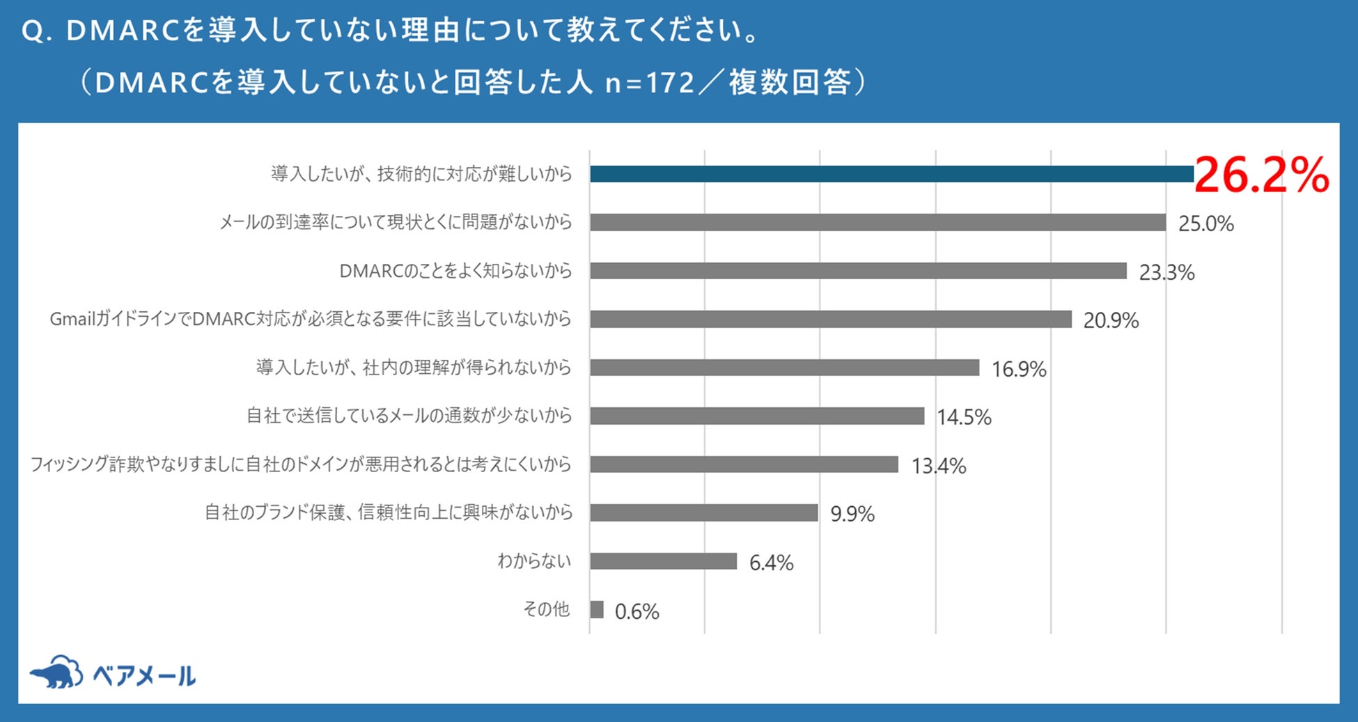 DMARCを導入していない理由のトップは「導入したいが、技術的に対応が難しいため」。