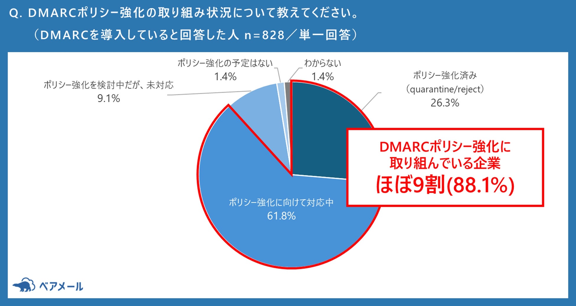 DMARCのポリシー強化の状況については、26.3%が「ポリシー強化済み(quarantine/reject)」、61.8%が「ポリシー強化に向けて対応中」と回答し、約9割(88.1%)の企業がポリシー強化に取り組んでいることが分かります。