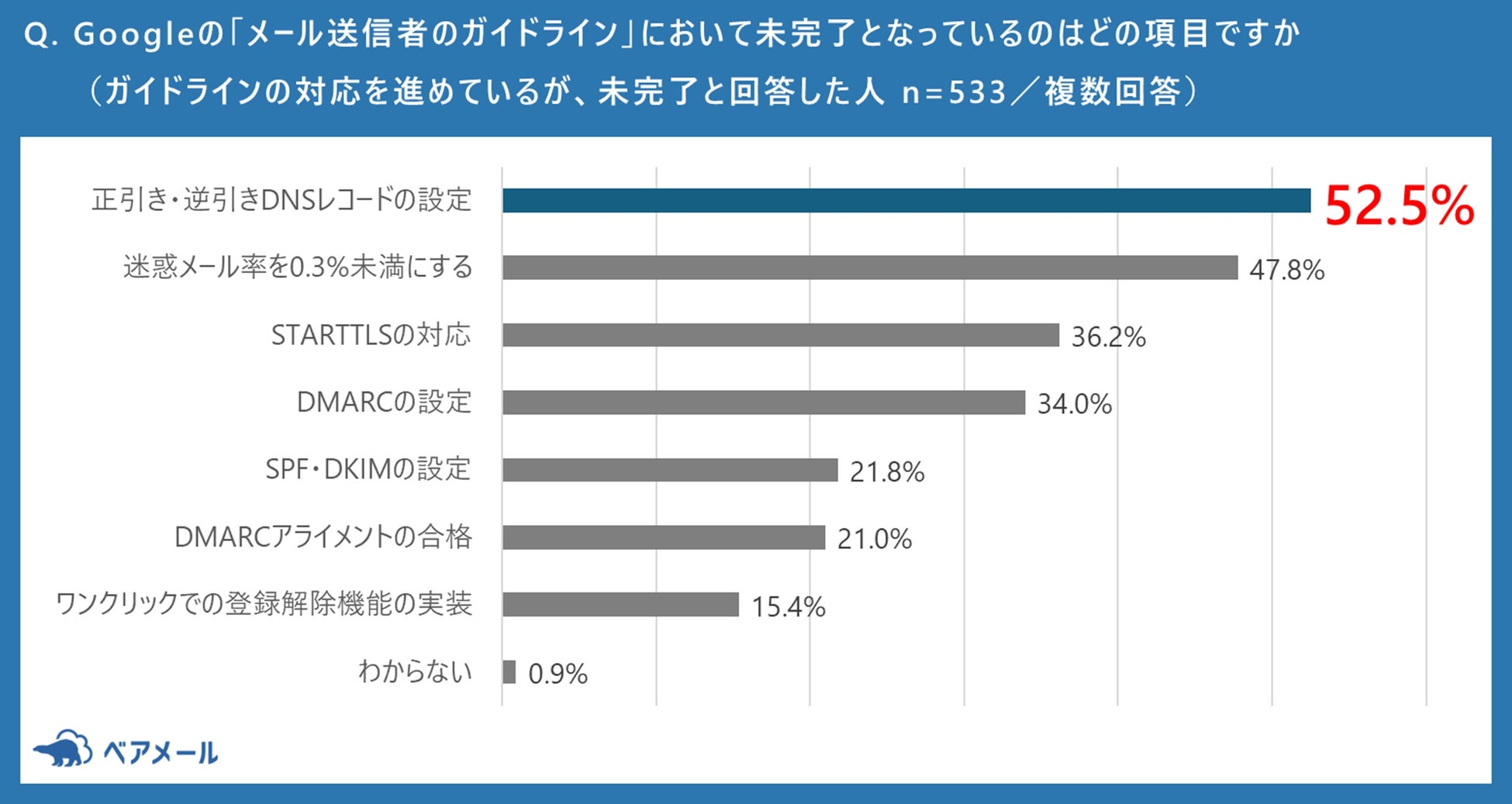 ガイドライン対応の未完了になっている項目のトップは、前回調査時と変わらず「正引き・逆引きDNSレコードの設定」でした。