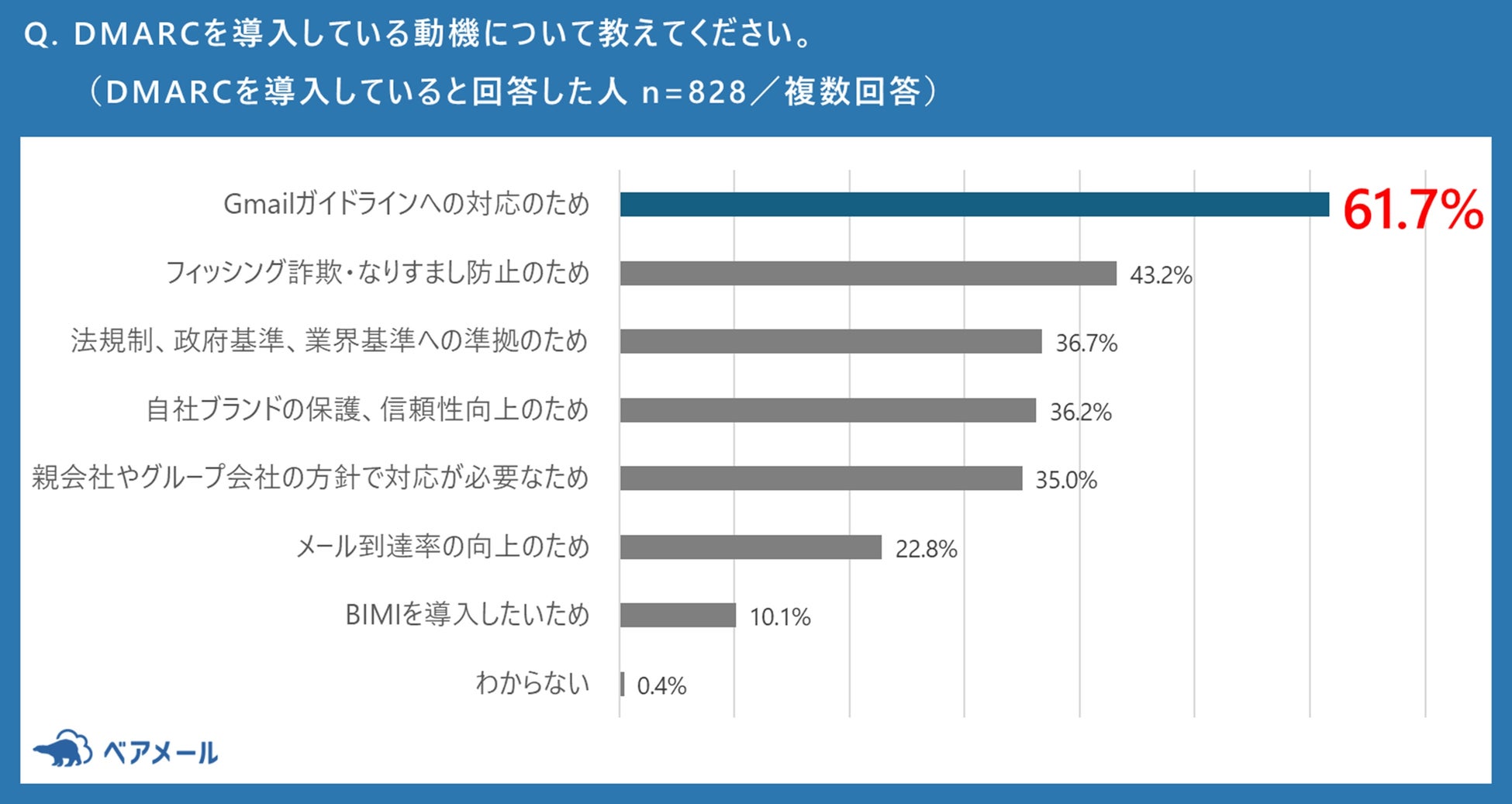 DMARCを導入した動機としては、「Gmailガイドラインへの対応のため」が61.7%で最も多い結果となりました。やはりGmailガイドラインの影響が大きかったことがうかがえます。