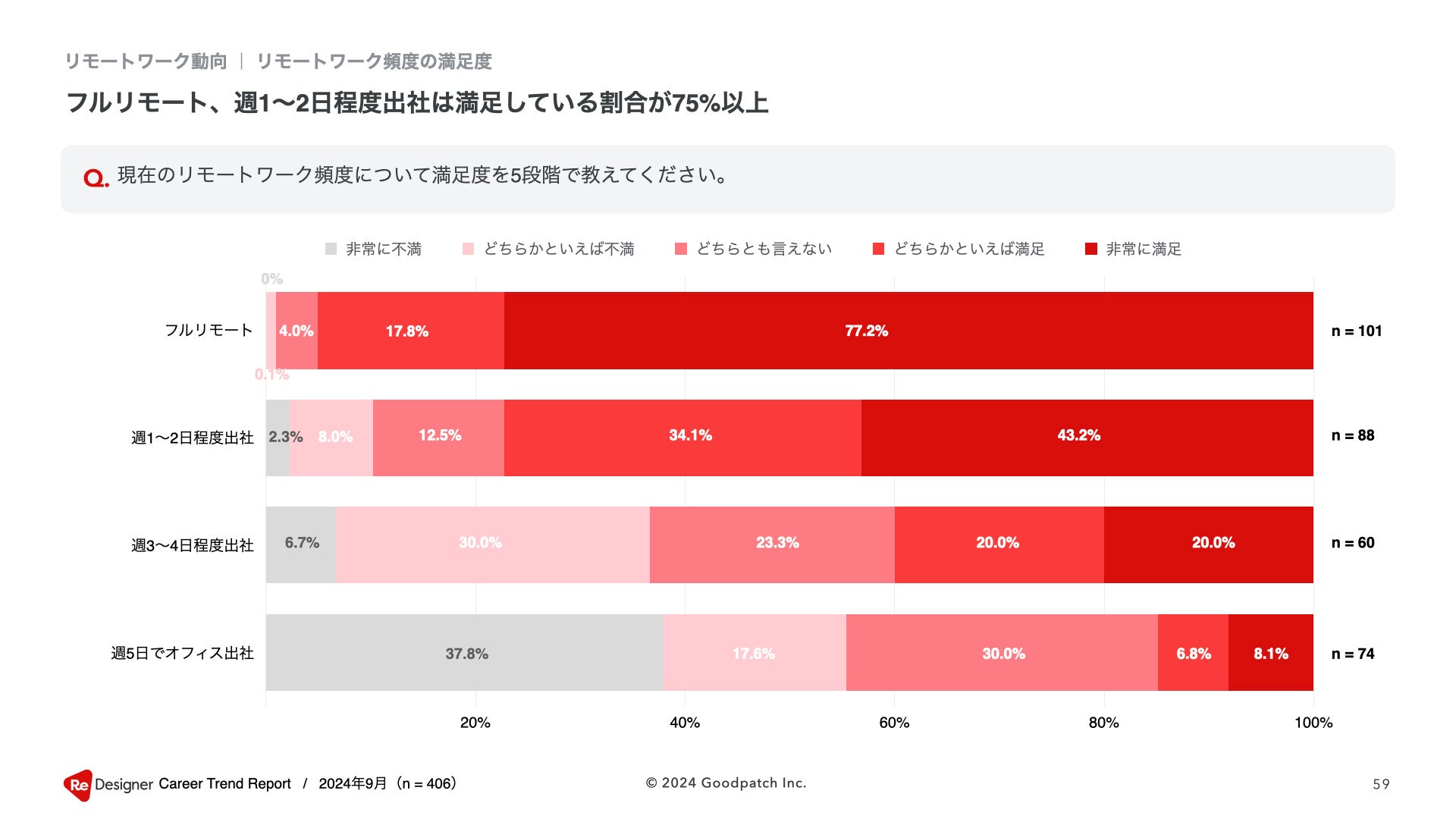 リモートワーク頻度の満足度は、出社頻度が高くなるにつれ満足度が下がる傾向。フルリモートでは95.0%、週1〜2日程度出社は77.3%が満足と回答しているが、週3〜4日程度出社になると40.0%と一気に低下する