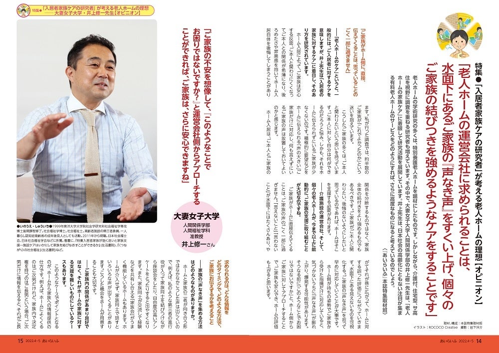 特集は、「『入居者家族ケアの研究者』が考える老人ホームの理想【オピニオン】」です。老人ホーム入居によって、家族は安心する反面、入居者本人との関係が希薄になり、後ろめたさや罪悪感を抱いて後悔してしまうことがあります。「老人ホームの運営会社に求められることは、水面下にある家族の『声なき声』をすくい上げ、個々の家族の結びつきを強めるようなケアをすること」と語るのは、「老人ホームの家族ケア」に着眼して研究活動を行っている大妻女子大学人間関係学部の井上修一先生。お話をうかがいました。