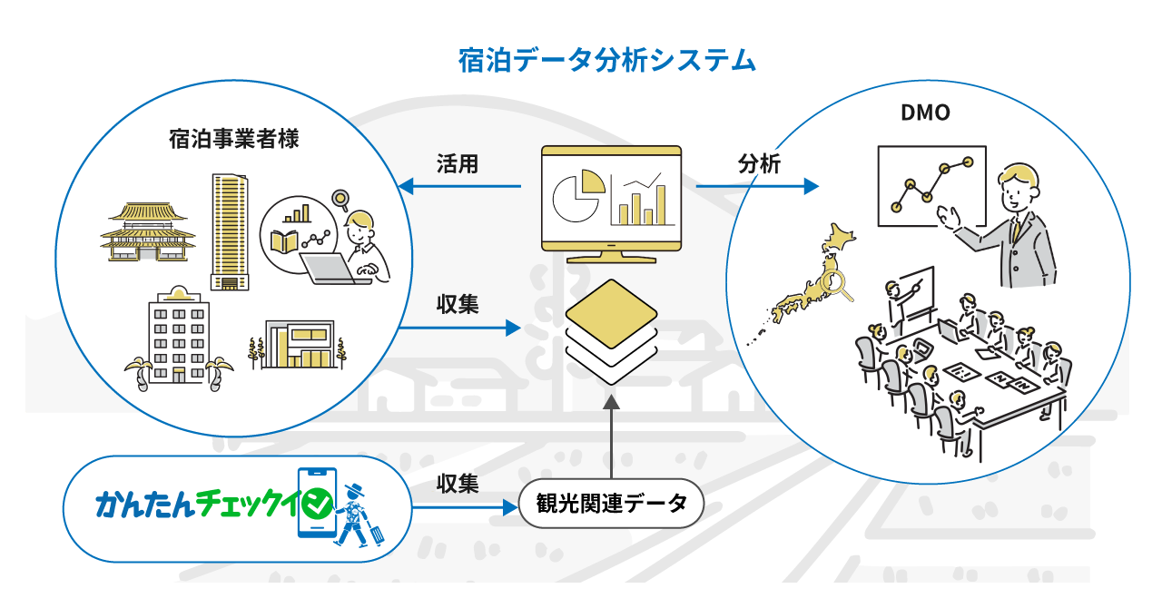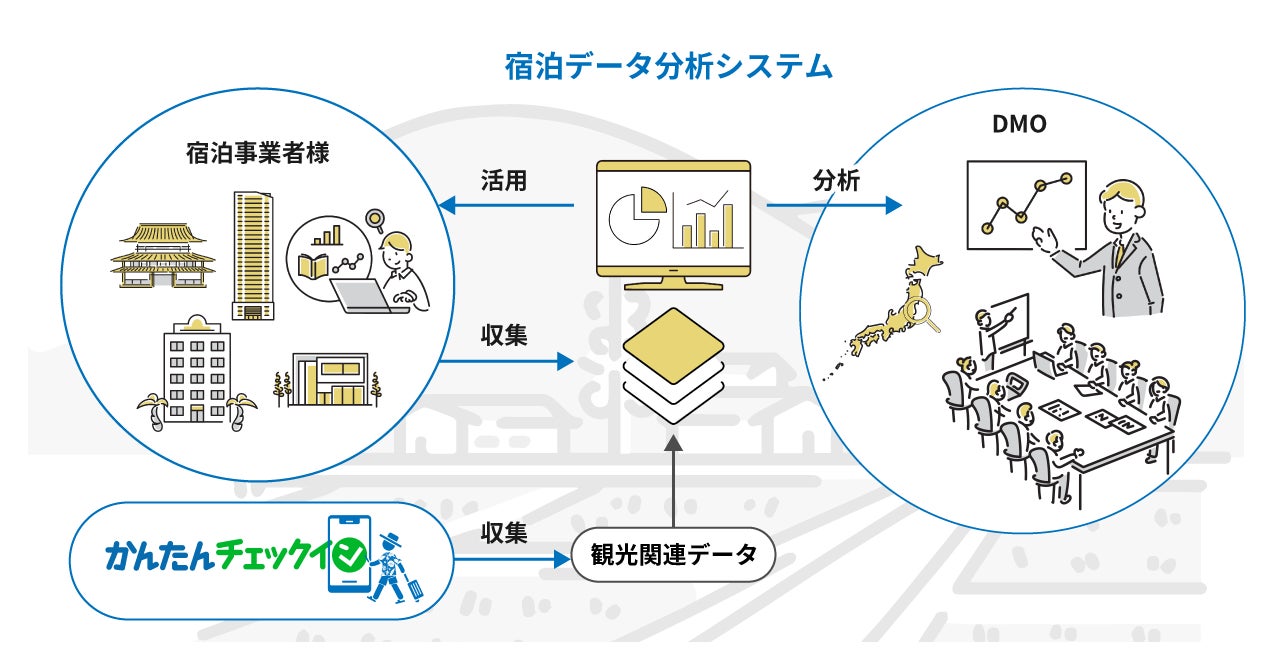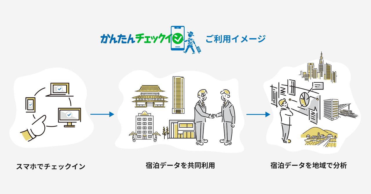 このうち、参画施設の負担なくデータを集めるための仕組みづくりにおいて、PMS等を導入していない小規模施設を中心に少なからず負担が生じており、その解消が課題となっておりました。そのため、参画施設にもデータ提供のメリットがあり、負担なく地域で活用するデータを集める仕組みづくりができるツールとして『かんたんチェックイン』をリリースしました。