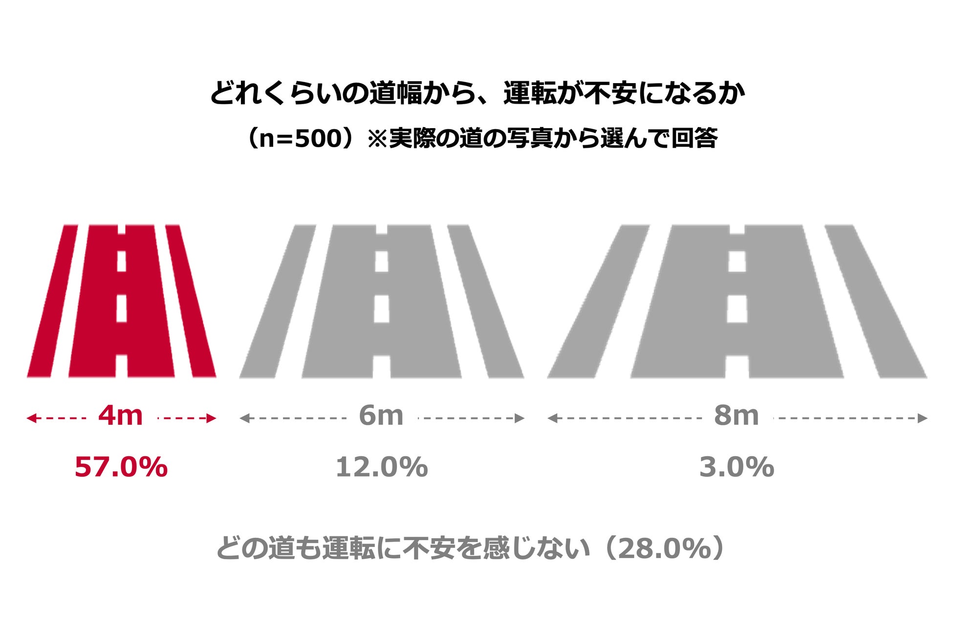 4.一方、クルマで行くおでかけ先を決める際、「道の狭さ」など、行き先までの「道路状況」を理由に、行き先選びに悩む人が半数近く存在することが明らかになりました。具体的に伺ってみると、「道幅4m程度」から運転に不安を感じると回答した人はおおよそ6割という結果になりました。