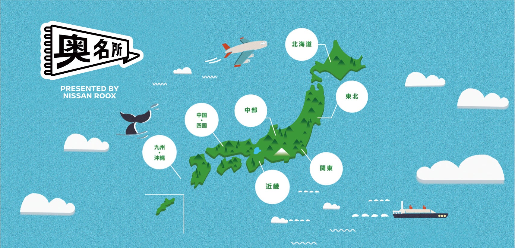 そこで、日産ルークスは、運転サポート機能満載で家族のおでかけをもっと楽しくする軽自動車として、家族の「おでかけのマンネリ化」の解消を目指すべく、日本全国の隠れたおでかけスポットに着目。「細い一本道の先にある隠れた名店」「曲がりくねった小道を抜けた先にある素敵な展望台」といった、狭い道の先にあるからこそのドキドキ感や非日常感を味わえる、魅力的な家族のおでかけスポットを「奥名所」と命名し、発信する「奥名所 Presented by NISSAN ROOX」を企画しました。日本各地の奥名所をまとめた「奥名所マップ」は特設サイトにて公開します。